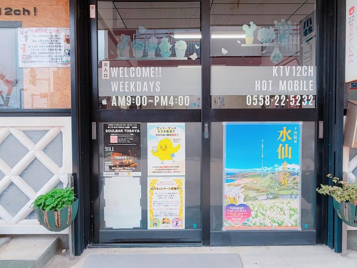 地元に根付くテレビ放送局で僕も下田八幡神社例大祭でたくさんお神輿担いでる所を放送していただいています、小林テレビ本社オフィスのエントランスに方法掲示板、店内案内板などに土佐屋のクラファンポスターを掲示していただいています。