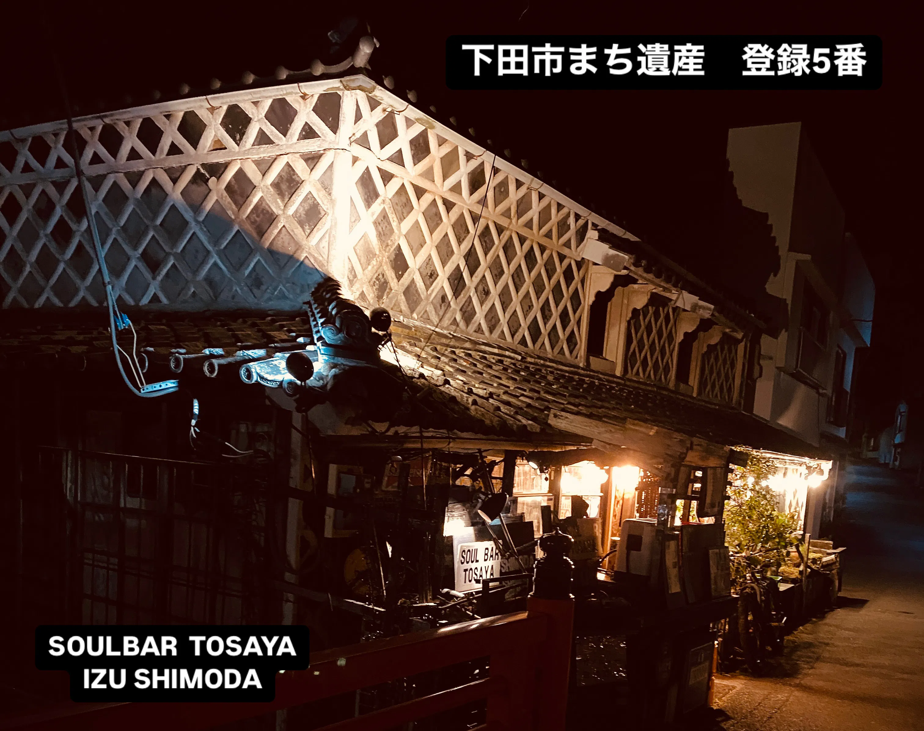 外壁の格子模様「なまこ壁」が特徴で、下田市登録まち遺産第5号にも認定されている。 店主の齋藤能仁(よしひと)さんがこの場所にソウルバーを開いたのは18年前。