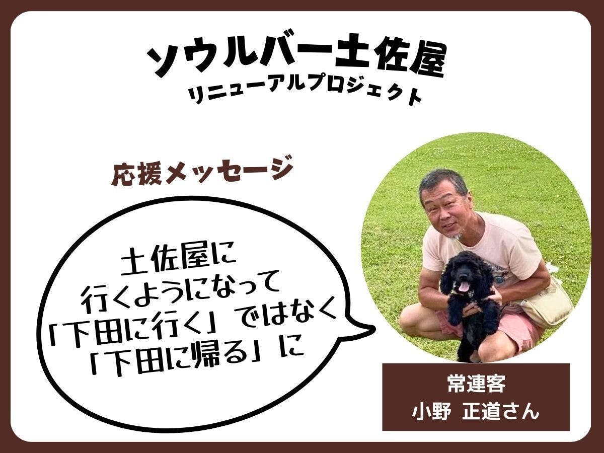 土佐屋を気に入って下田に通い続け、なんと下田に家まで買ってしまった小野正道さんからも応援メッセージが届きました。