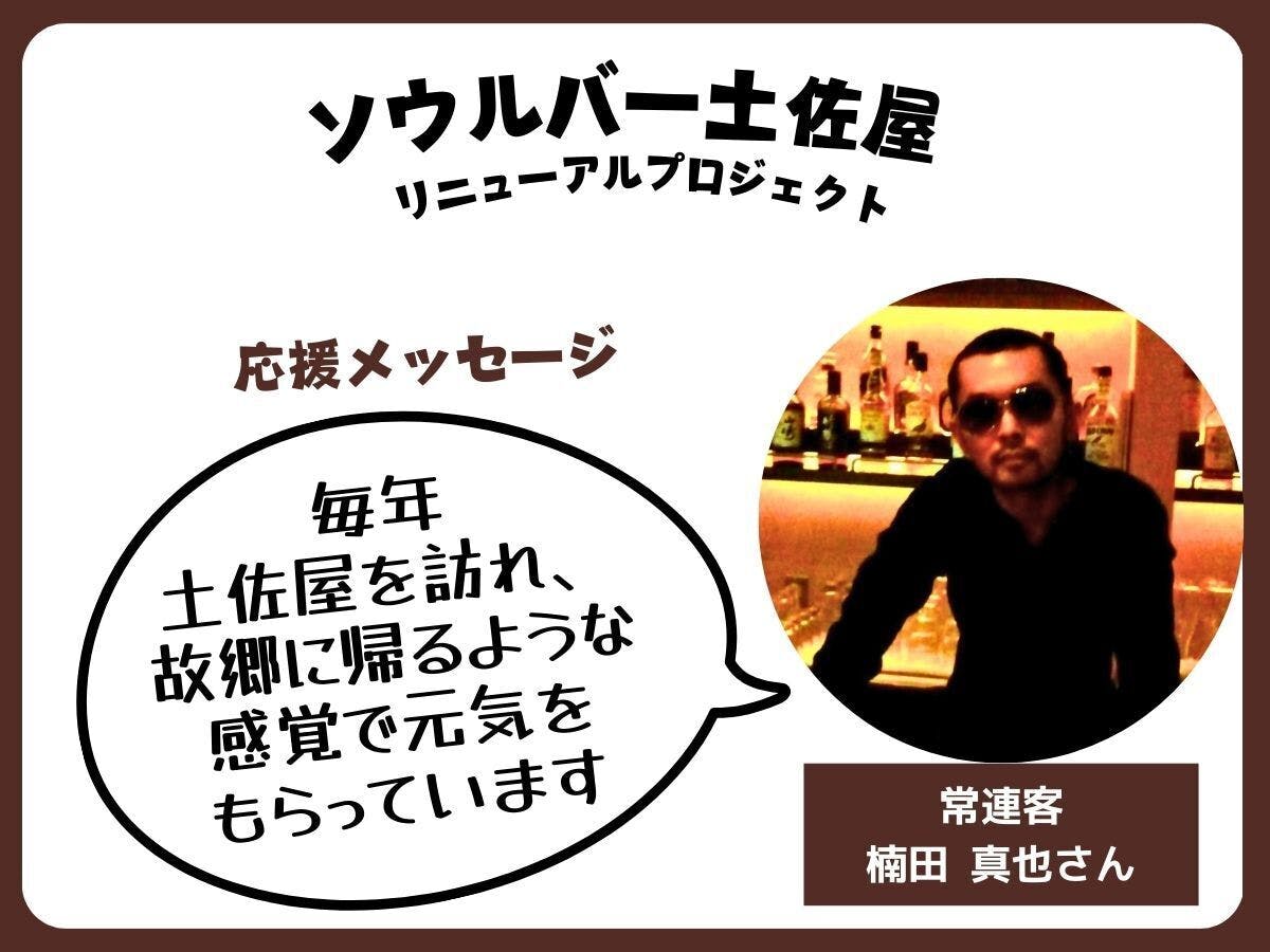 わざわざ博多から通ってくれている、東京両国でお店をやっていた頃からの常連客・楠田真也さんから応援メッセージが届きました!土佐屋の常連の中でも最古参の一人である楠田さん。これからもお互い、一緒に良い年齢を重ねながら楽しい時間を過ごしましょう!ご支援、本当にありがとうございます!!常連客・楠田真也さんからの応援メッセージ私にとって、SOUL BAR土佐屋は「もうひとつの故郷」であり、心の原点です。1999年、東京でSOUL BARを巡る生活に憧れ、「会社帰りにSOUL BARで一杯」という大人の夢を胸に、博多の小僧が上京した先が両国でした。ある日、JR両国駅のホームから見えた"SOULBAR"の看板。そのまま引き寄せられるように扉を開けた先が、"SOUL BAR Philadelphia Motor Town"でした。重厚な鉄の扉を開けると、斉藤店長が迎えてくれ、ターンテーブルもなくカセットテープの音が流れていたのが懐かしいです。「一番安くボトルキープできるウイスキーはなんですか?」と斉藤店長に尋ねたことも鮮明に覚えています。ウイスキーの味もわからず、少ないお金で人生初めてキープしたのが「フォアローゼス」のボトル。カウンターでロックを飲みながら、大人の仲間入りをした気分を今でも覚えています。そして、初めて土佐屋を訪れた際に一番に感じたことは、"Philadelphia Motor Town"の空気を感じたことでした。斉藤店長がそこにいて、両国でよく聴いた音が流れている。自分の東京の原点が下田で息を吹き返したようで、感動と懐かしさに胸が高鳴り、まるでタイムスリップしたかのような不思議な感覚でした。今では毎年博多から土佐屋を訪れ、たくさんの人々と出会い、まるで故郷に帰るような感覚で元気をもらっています。土佐屋は私だけでなく、多くの方々にとっても心の拠り所であり、地域に根差した大切な存在です。その趣ある建物は、ペリーロードの景観を彩る地域の宝でもあります。建物の老朽化という困難を迎えていますが、この特別な場所を未来へ繋げるお手伝いができることを心から嬉しく思います。微力ながら支援させていただきます。この思い出の詰まった空間が、これからも多くの人々の心を癒し、歴史を刻み続けられるよう、皆さまの温かいご支援をどうかよろしくお願いいたします。九州 博多 楠田真也