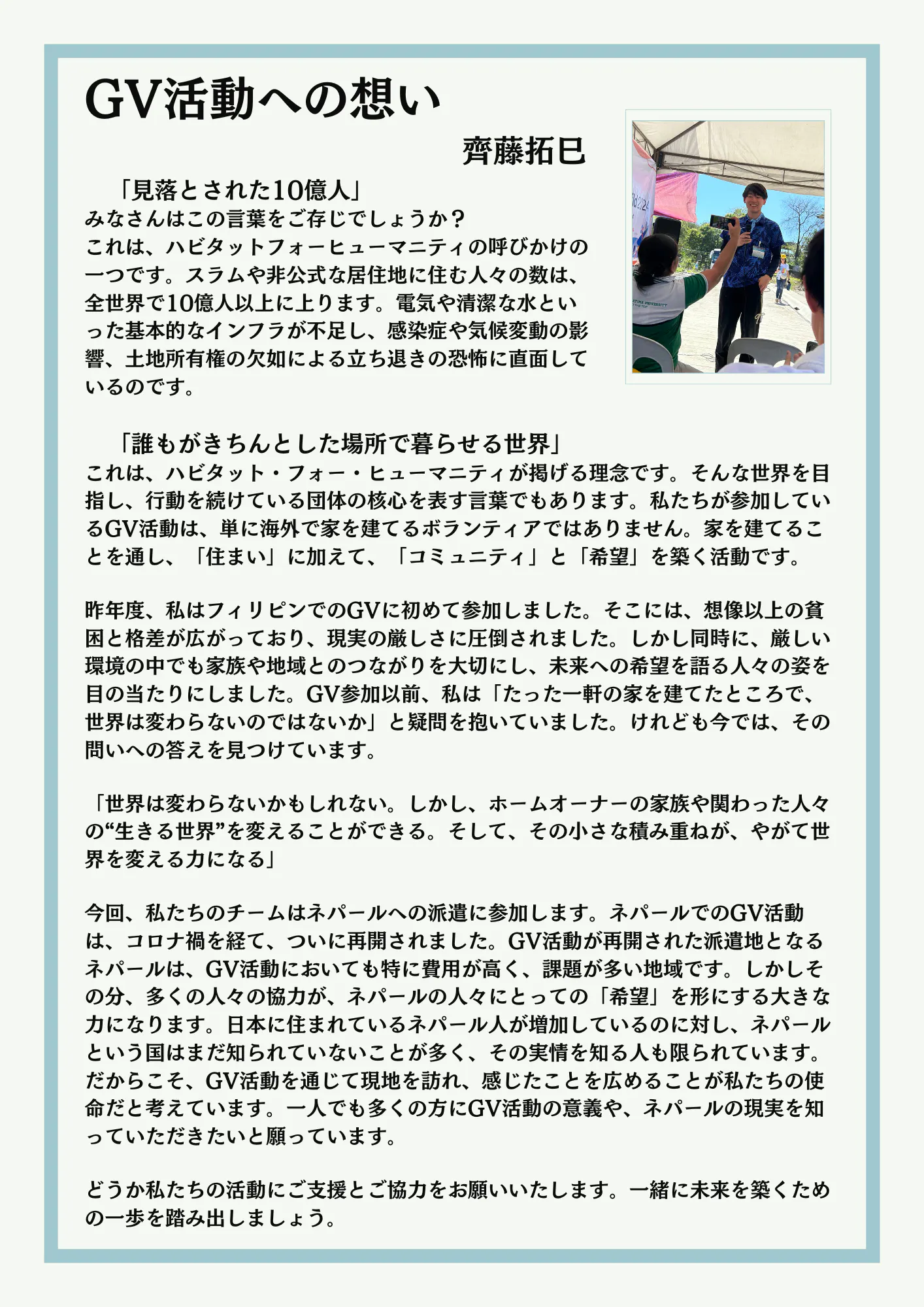 私たちは、この度Habitat for Humanity(ハビタット・フォー・ヒューマニティ)が実施しているグローバル・ビレッジ(GV: Global Village)プログラムに参加する形でネパールへ渡航します。GVプログラムに参加するボランティアは、海外の支援地を訪ね、ハビタットのパートナーとなる家族とともに、約10日間の滞在中、家の建築や修繕を通じて、家族が適切な生活環境を手に入れることを目指すというものです。