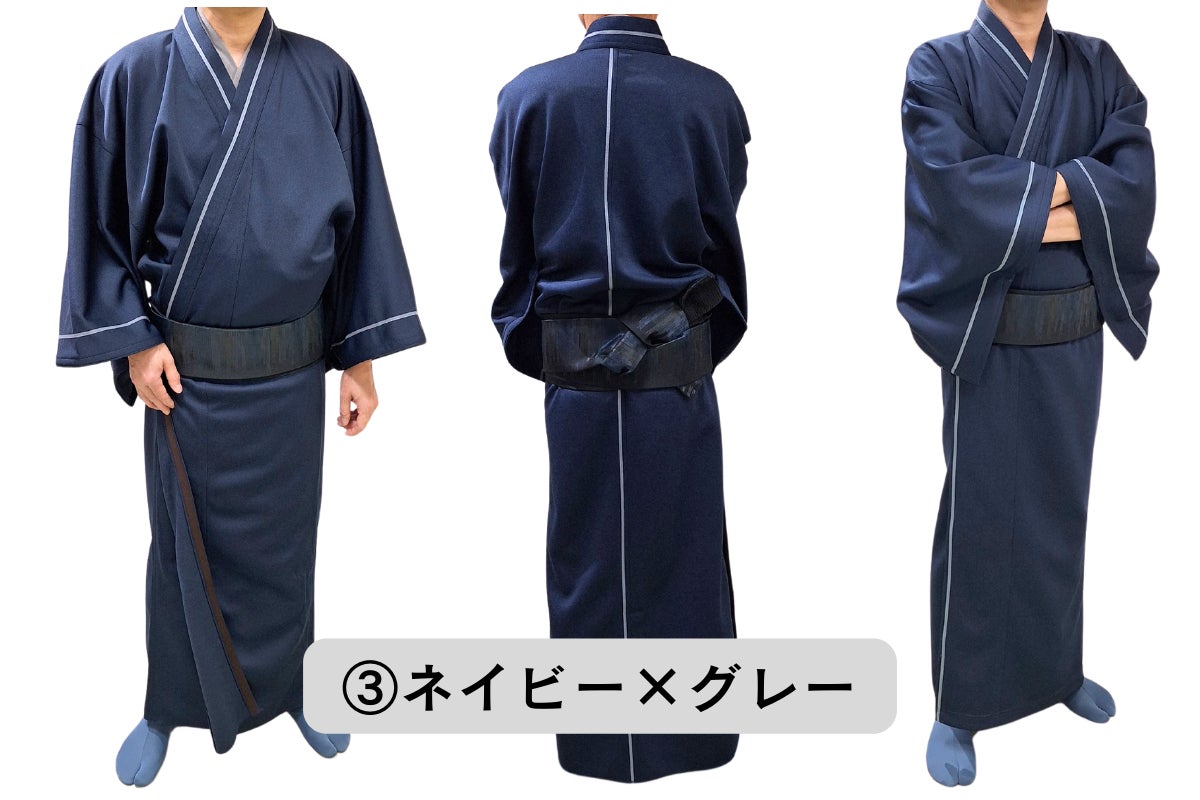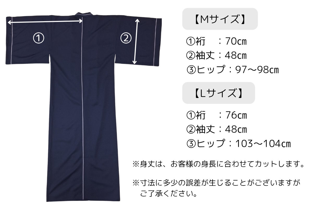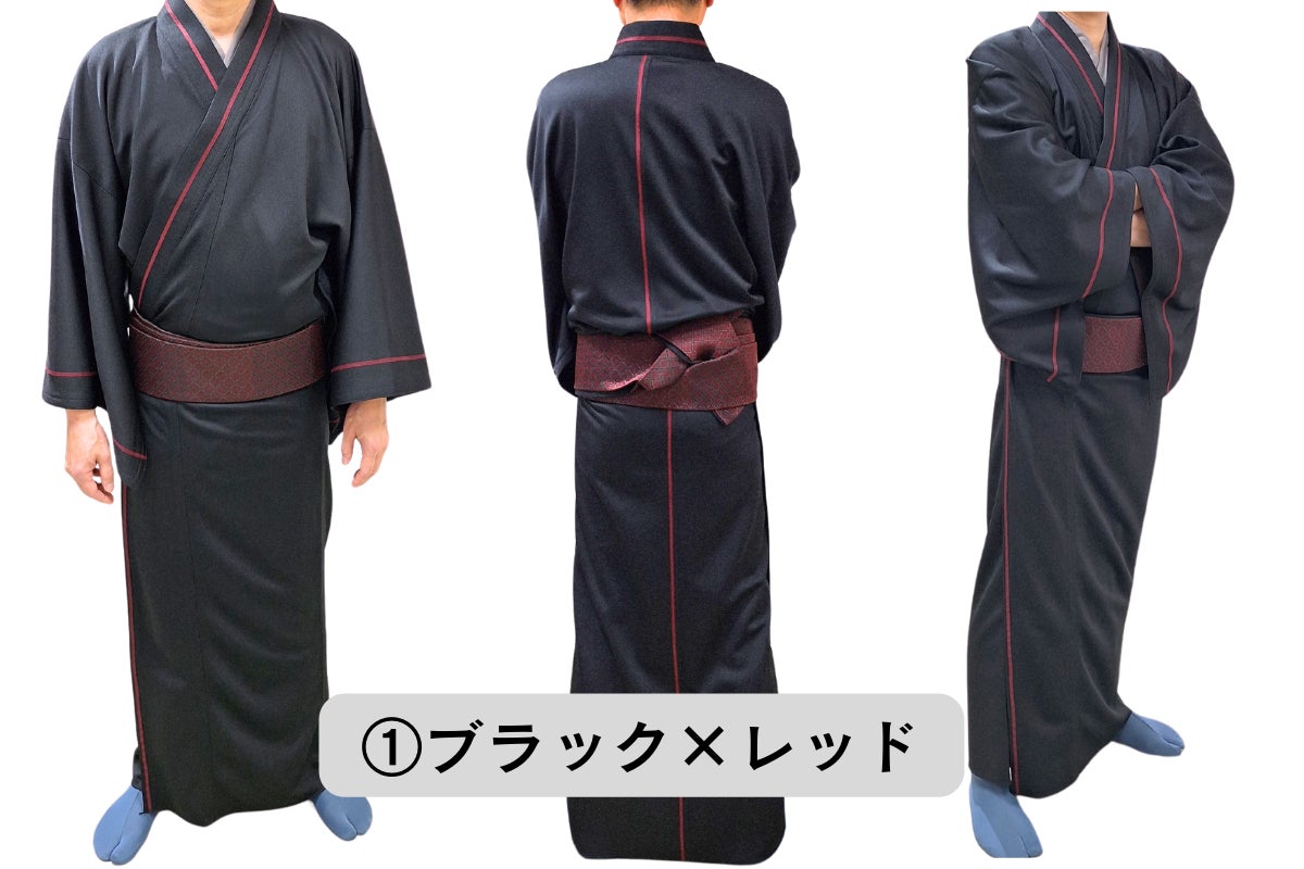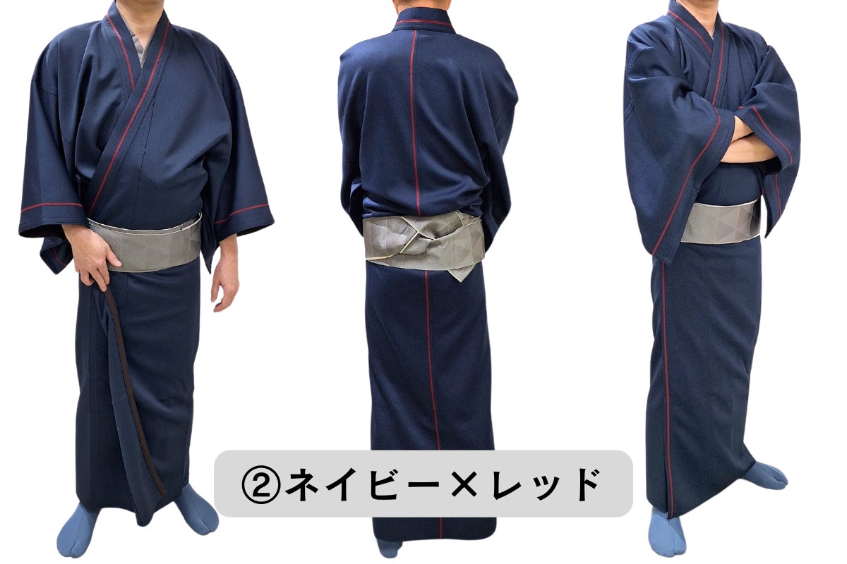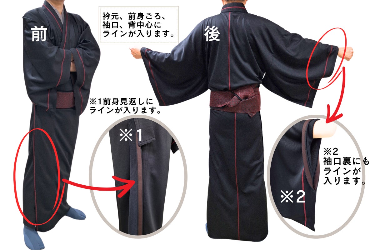 衿元・袖口・背中心にラインが入ったデザイン。前身ごろと袖口の裏側にもラインが入っています。