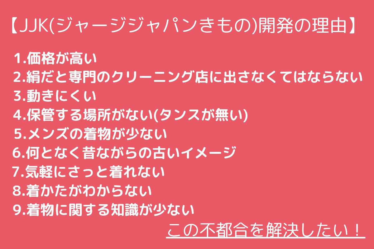 着物の魅力はその美しさだけでなく、着ることの楽しさにもあります。しかし、伝統的なきものは着にくいこともしばしば。そこで開発したのがジャージ生地の着物。JJK(ジャージ・ジャパン・きもの)。
