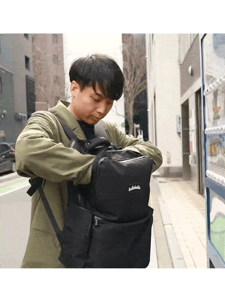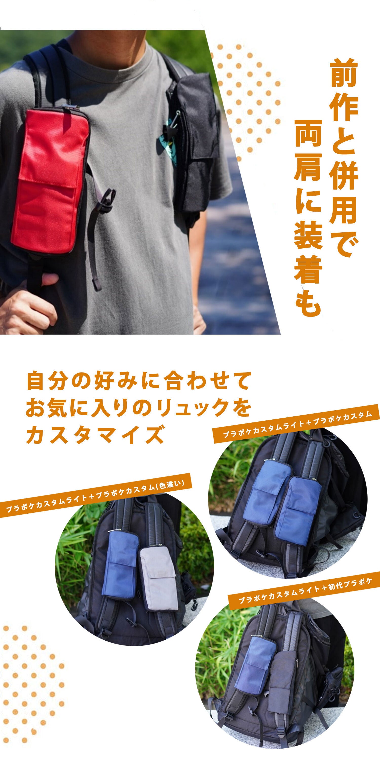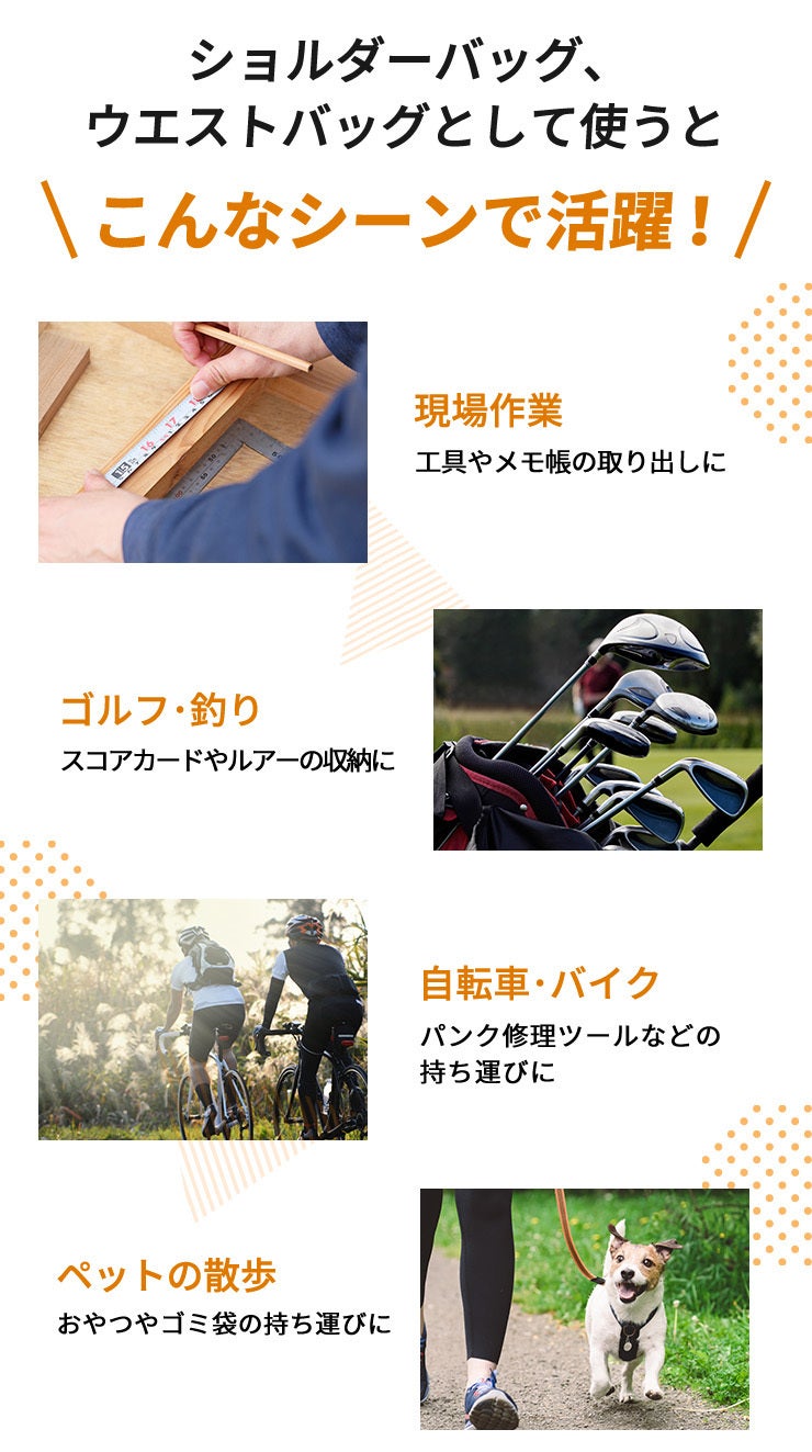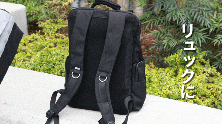 リュックはもちろん、トートバッグやショルダーバッグにも取り付け可能で、簡単に収納スペースが拡張できます。