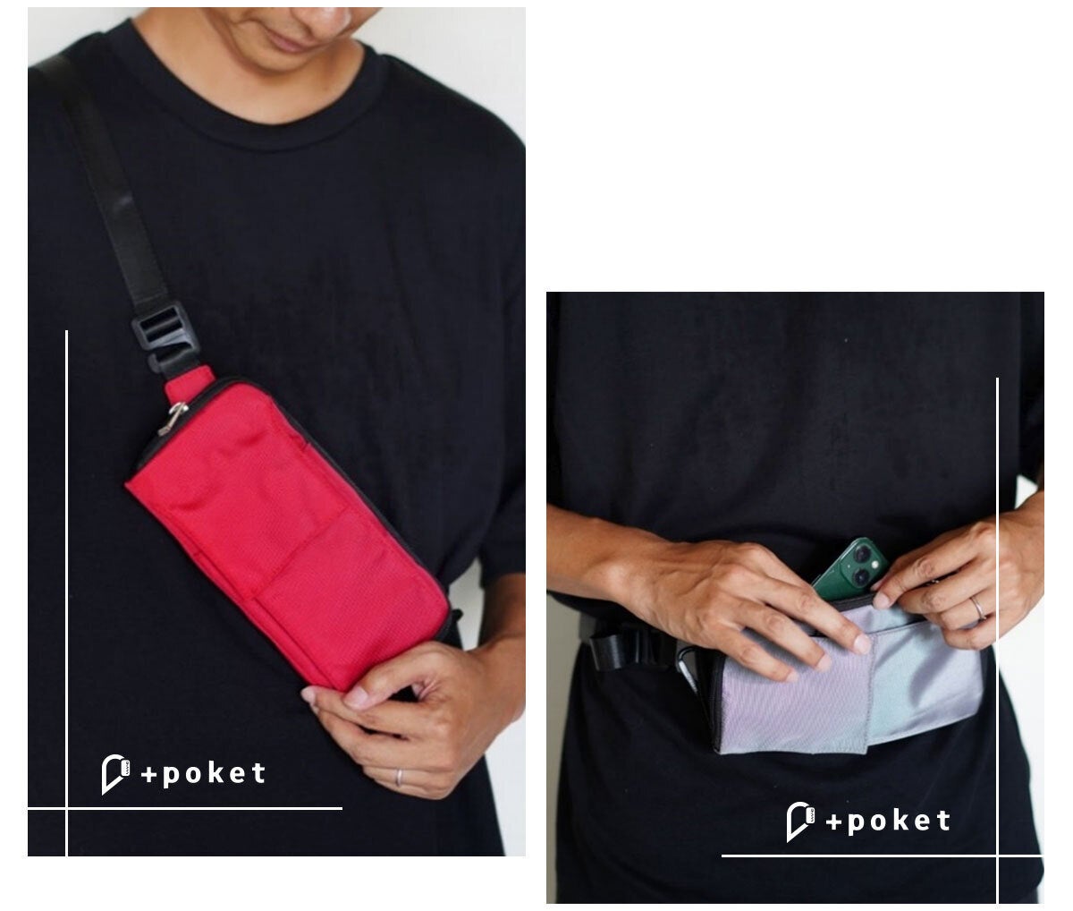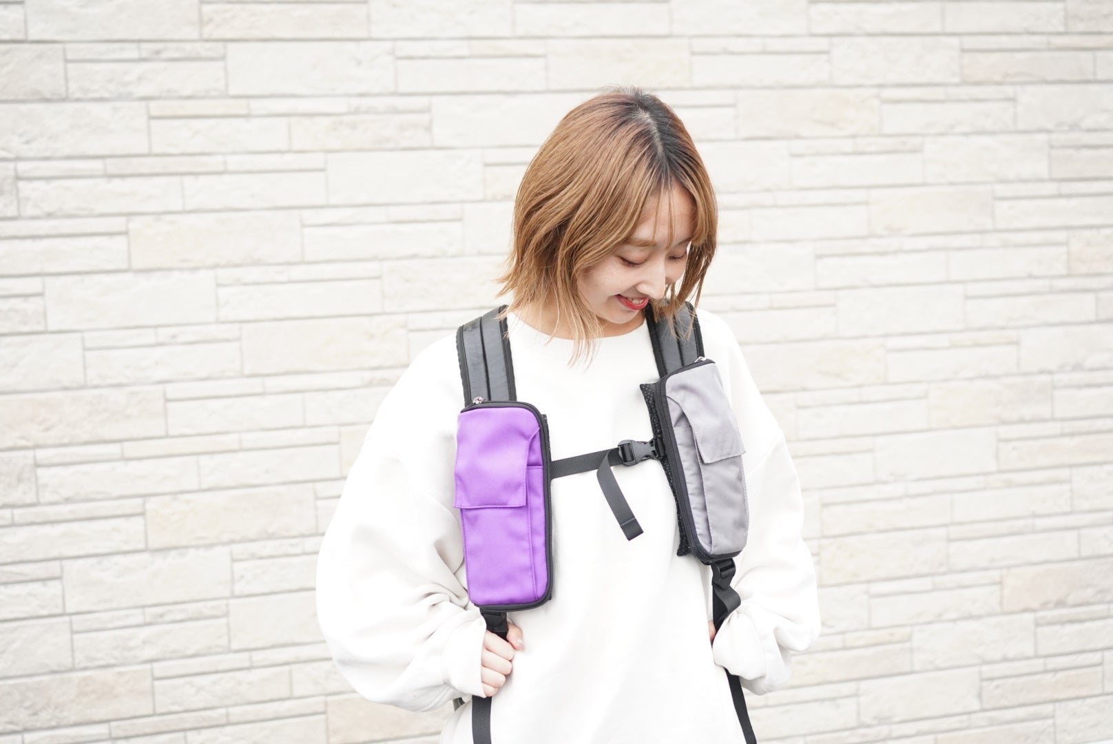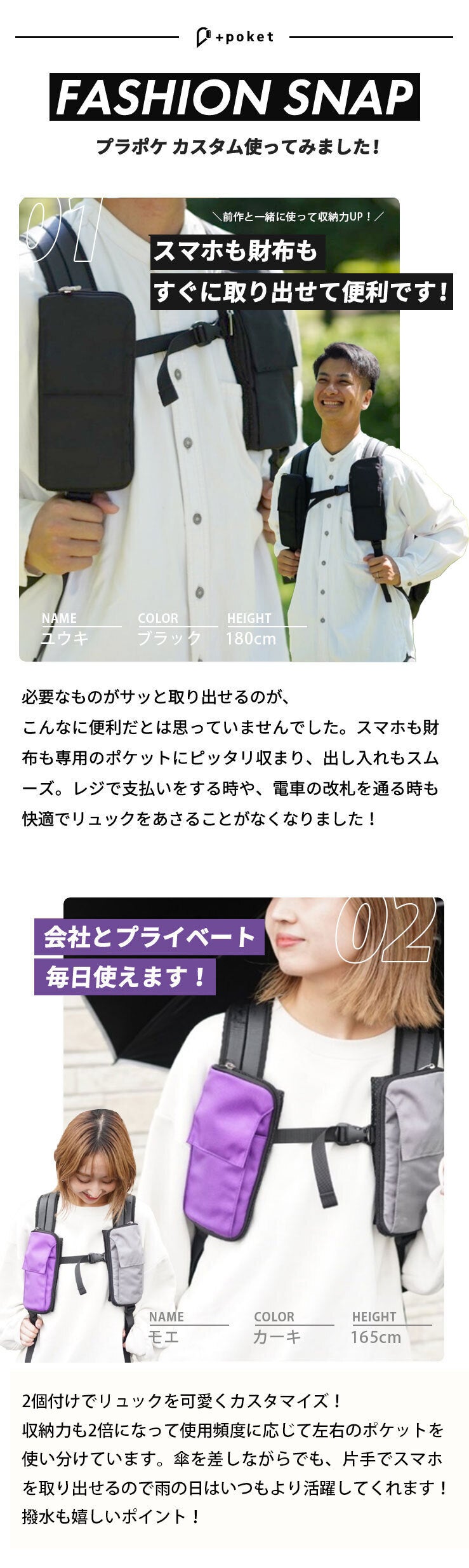 通勤・通学はリュックに取り付けてポケットバッグとして使用し、お昼休みはリュックから取り外してショルダーバッグにしてコンビニへ。用途に合わせて使い分けることができます。