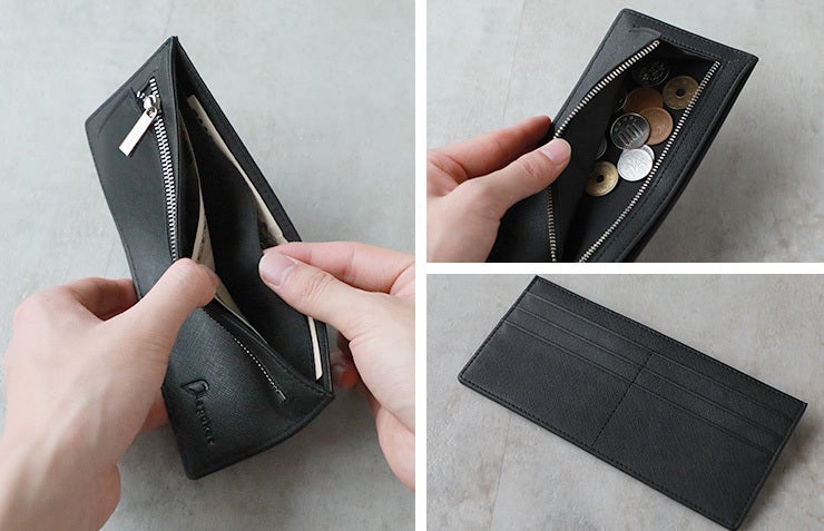 硬貨と紙幣、カード6枚を収納することができて、バッグがかさばりにくい超薄型のウォレットです。
