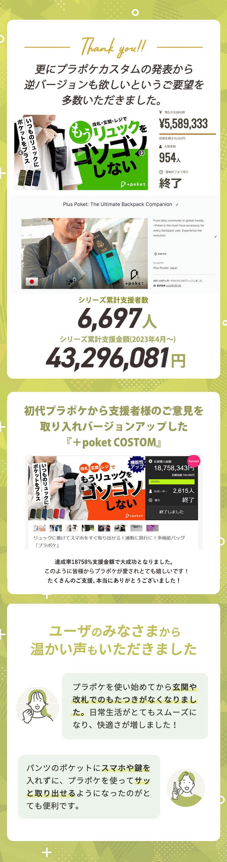 前回の【+poket】はとても大きな反響があり、最終的に海外でのクラウドファンディングにもつながりサクセスすることができました。、支援総額は1,800万円を突破、支援者様の総数も3000名を突破しました。