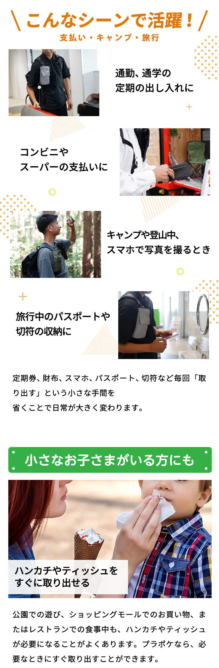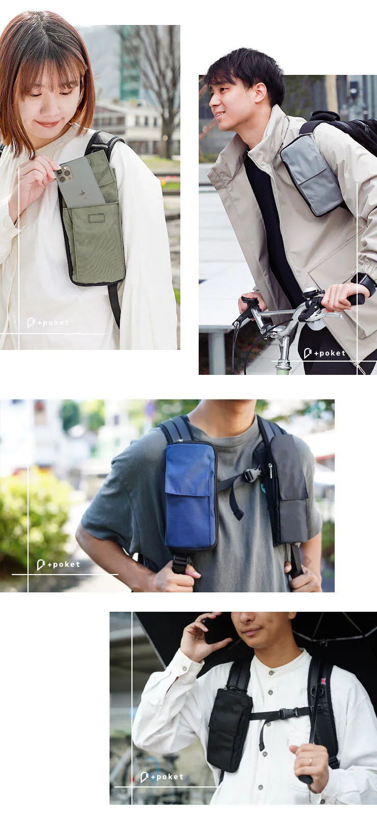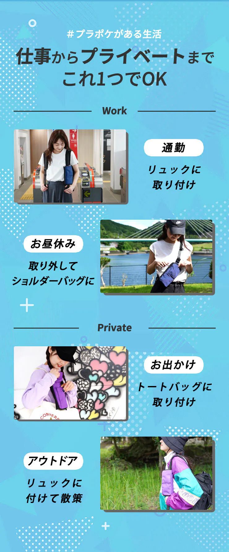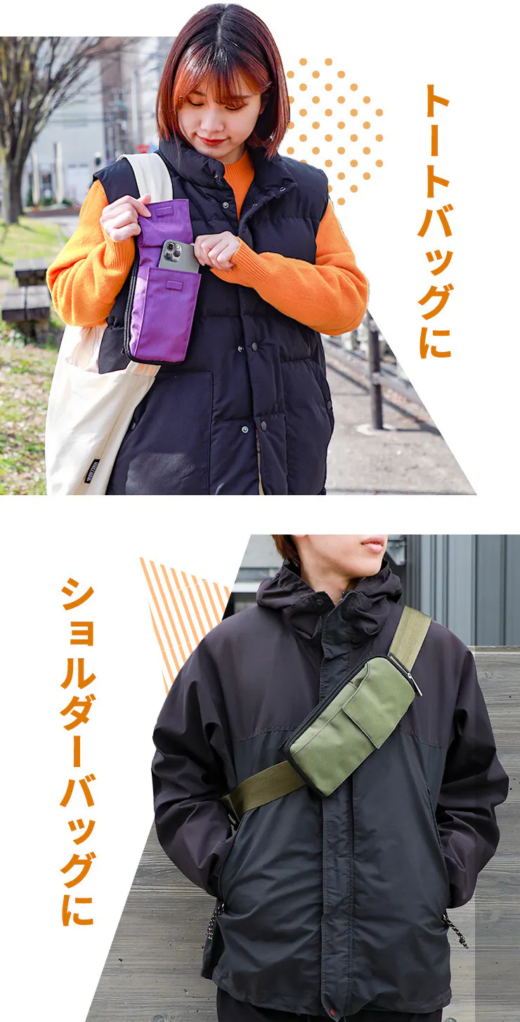 通勤・通学はリュックに取り付けてポケットバッグとして使用し、お昼休みはリュックから取り外してショルダーバッグにしてコンビニへ。用途に合わせて使い分けることができます。