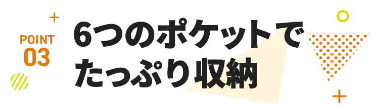 大ポケットには財布やモバイルバッテリー、デジタルカメラを。少し大きめのアイテムもらくらく収納できます。