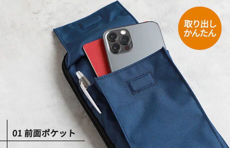 表にはスマホやパスポートを入れられるポケット。いつでもかんたんに取り出すことできます。