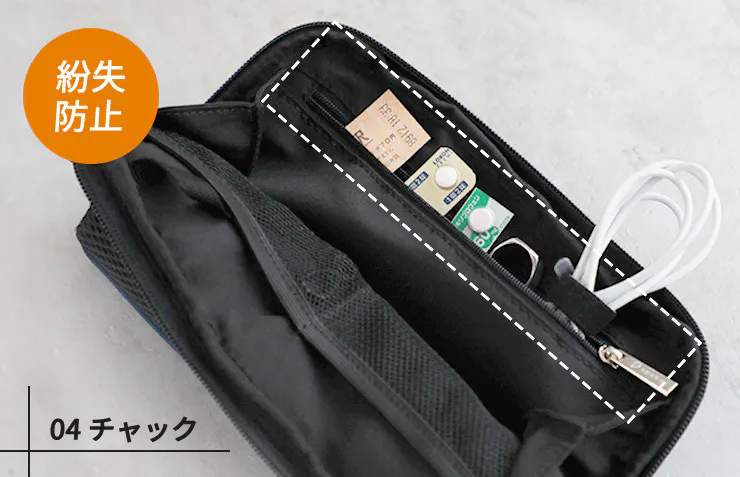 薬やアクセサリーなど小さくて紛失しやすい物はファスナー付きのポケットに。