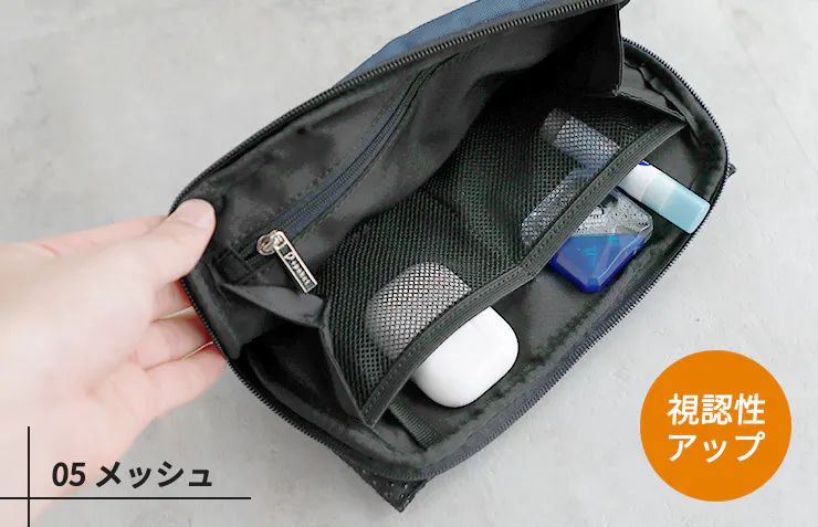 メッシュポケットは2つ。イヤホンや目薬、リップなどの小物を見つけやすいです。