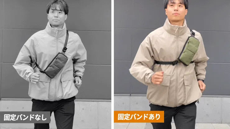 ランニングやウォーキング、自転車に乗るときなど、アクティブなシーンに活躍する固定バンド。しっかりと体にフィットしてバッグがぐらつきません。