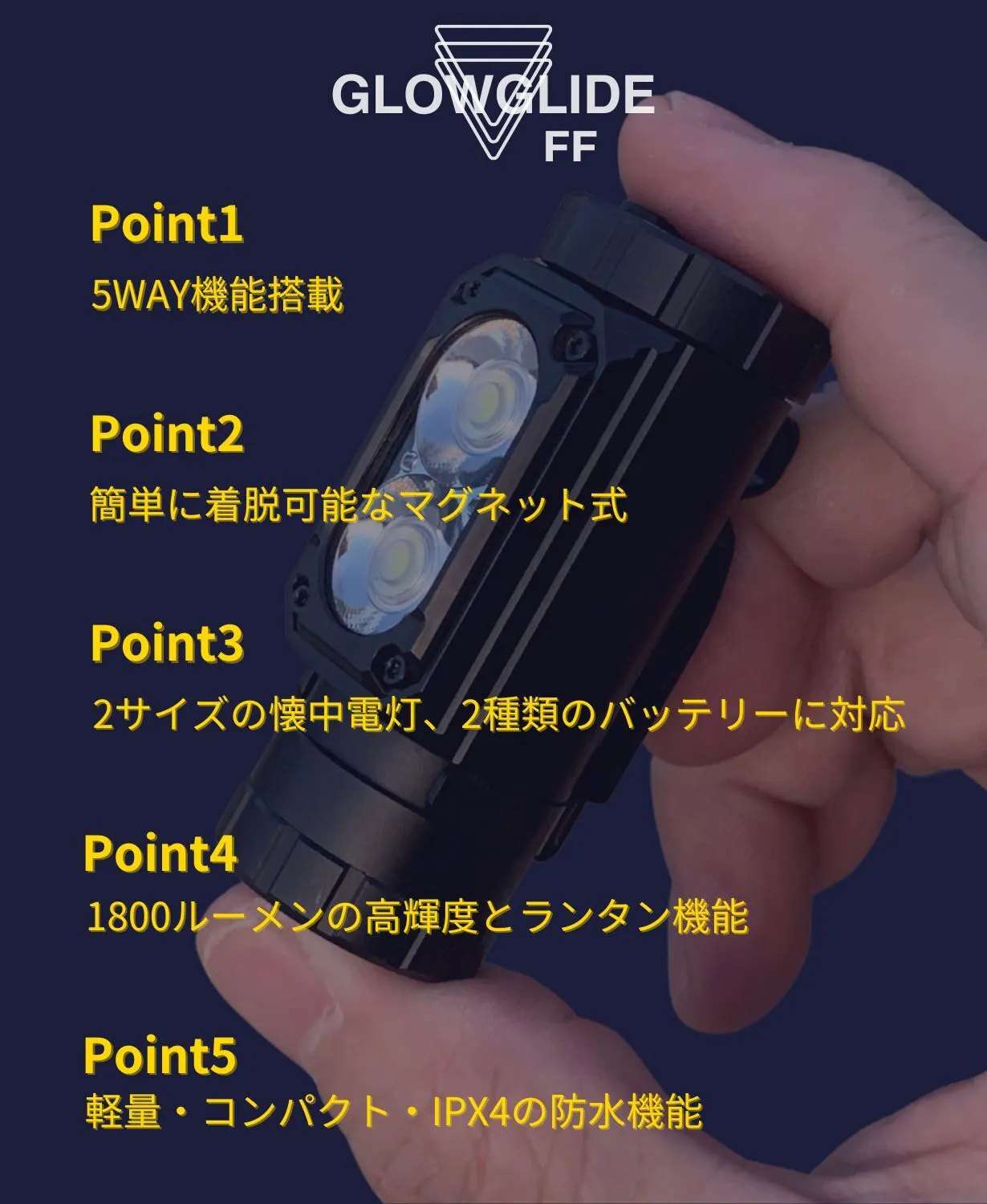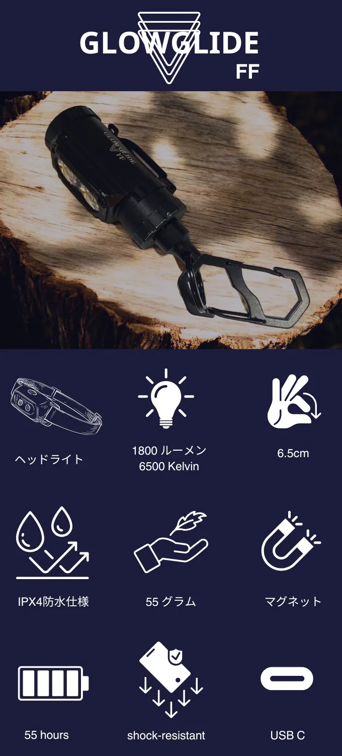 今回の「GLOWGLIDE シリーズ FF」は、アウトドアはもちろん、災害時や自転車での移動時にも対応できる、ランタン・ヘッドライト・懐中電灯の1台3役をこなす多機能な製品です。