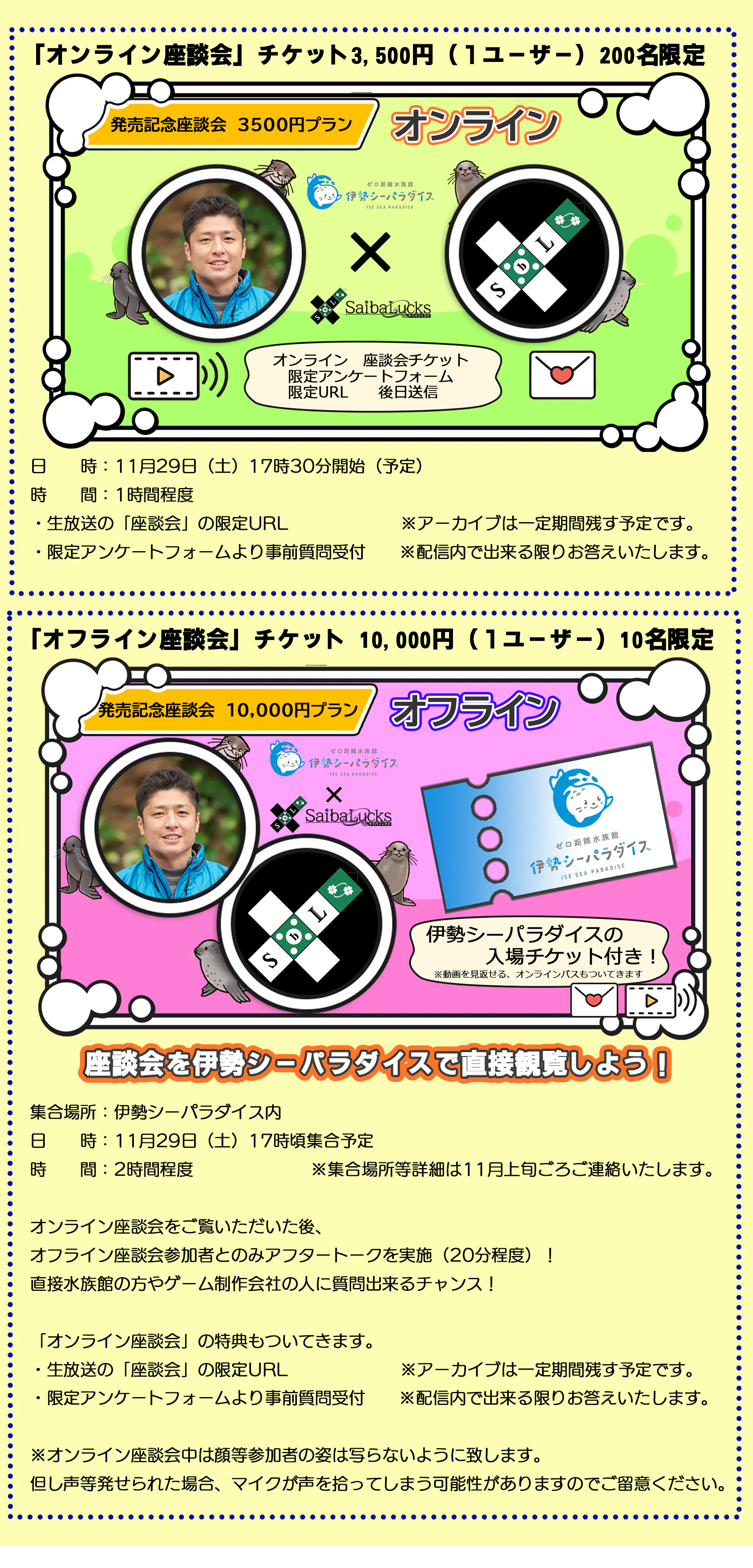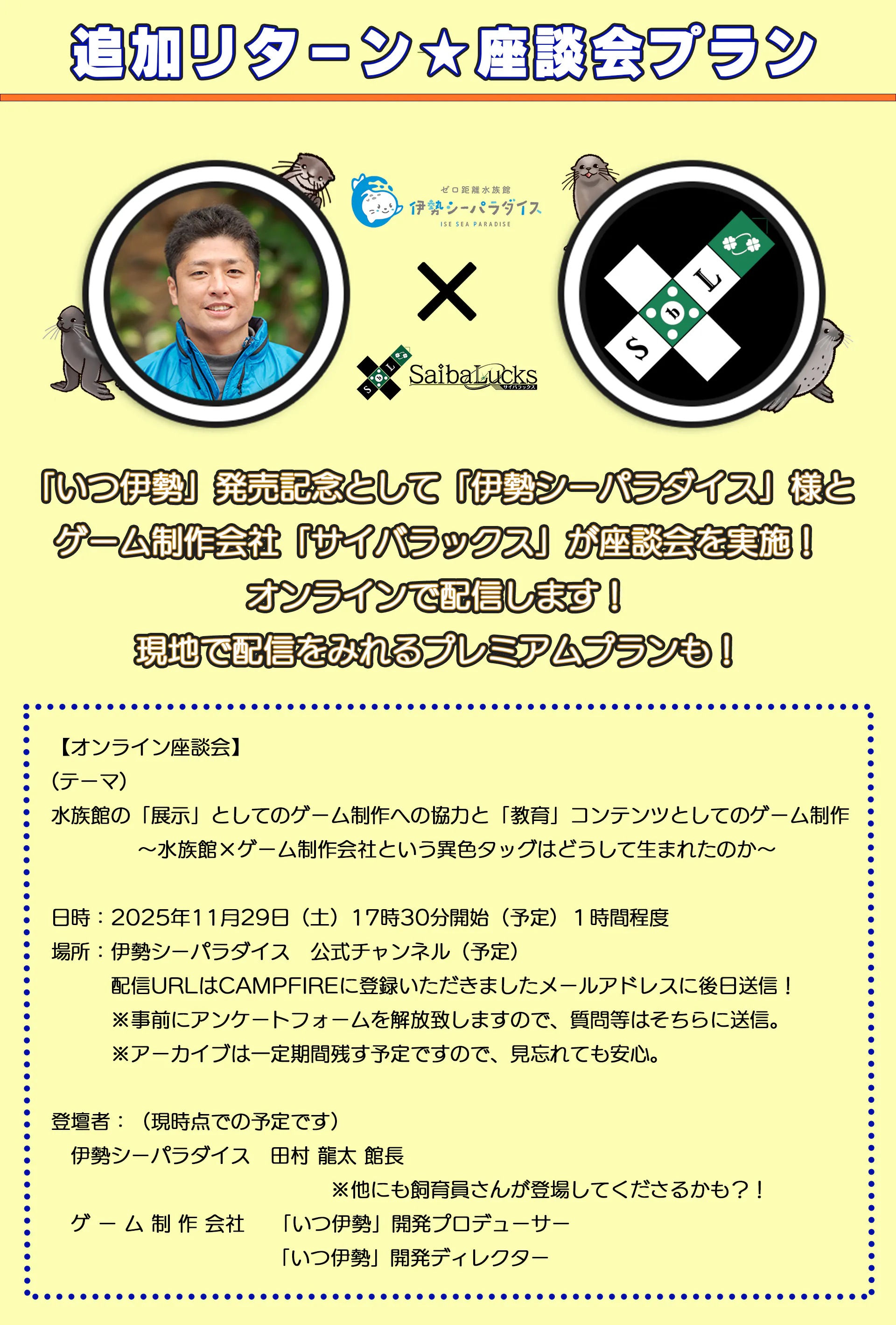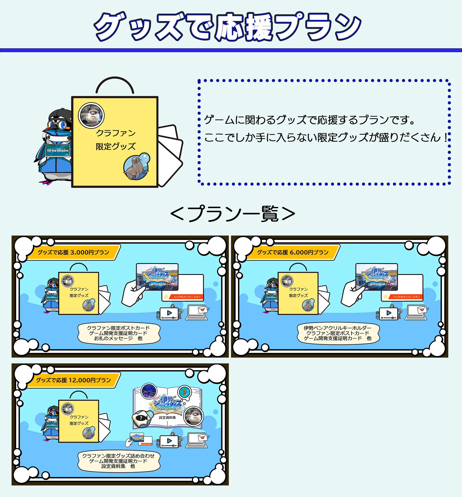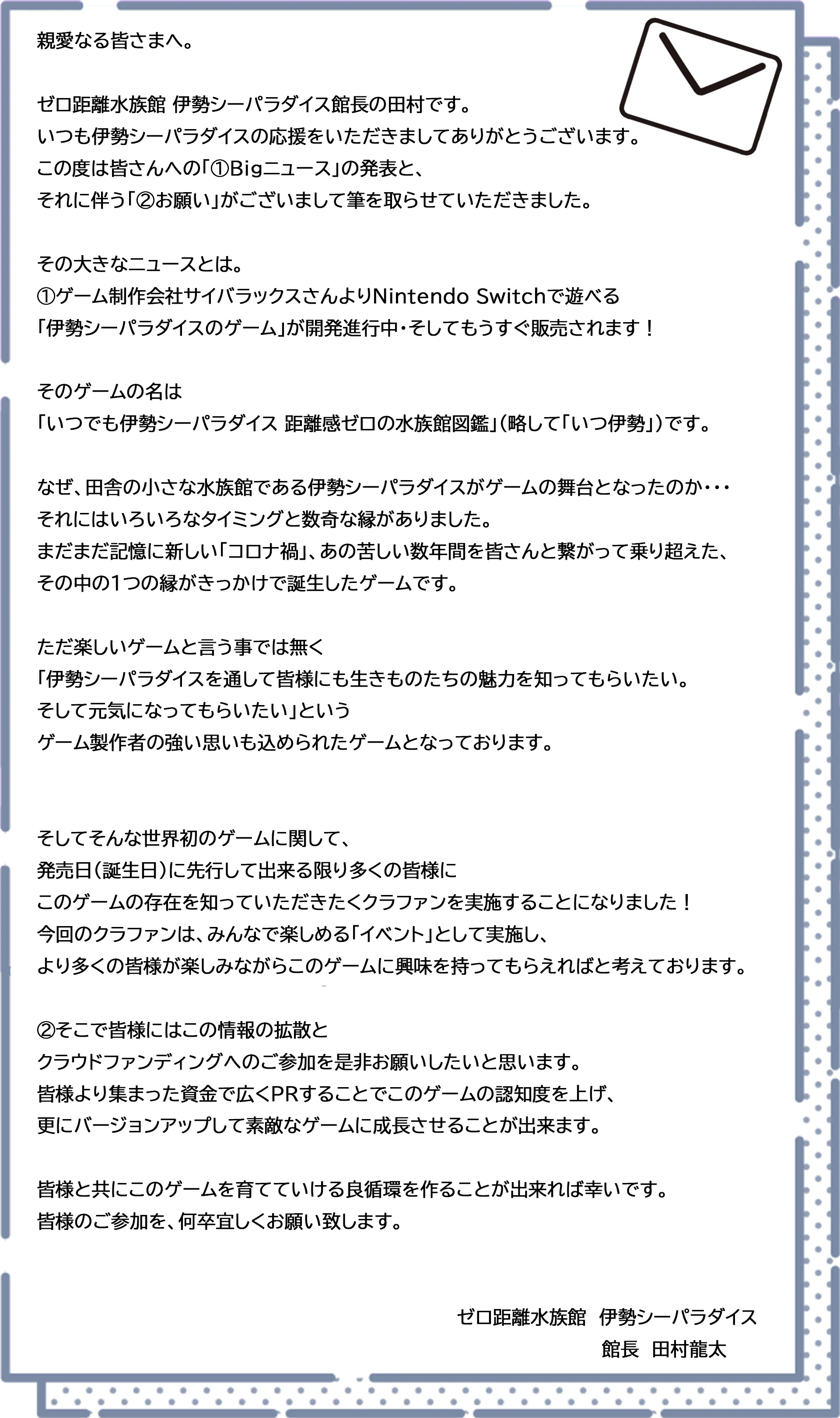 2025/12/03 12:00「いつでも伊勢シーパラダイス 距離感ゼロの水族館図鑑」応援プロジェクトをご支援してくださった皆様、応援してくださった皆様クラウドファンディングにて温かいご支援、ご応援を賜り、誠にありがとうございました。リターンを皆様にお届けさせていただきましたため、「いつでも伊勢シーパラダイス 距離感ゼロの水族館図鑑」応援プロジェクトをいったん終了とさせていただければと存じます。ここまで、応援していただきましてありがとうございました。最後になりましたが、本クラウドファンディングでご支援いただきました資金の使い道に関してご報告させていただきます。--------------------・クラウドファンディング手数料・リターン仕入れ費、制作費、発送費等・ゲーム制作費皆様に支援いただいたおかげで、最後のクオリティアップが可能になりました。「いつでも伊勢シーパラダイス 距離感ゼロの水族館図鑑」を今の形で世に送り出せたのは、皆様のご支援あっての賜物です。改めてありがとうございました。・広告・宣伝費ポスターなどの制作費や、プレス費用などで使用させていただきました。・伊勢シーパラダイス様にお渡し金額を出すととても生々しいですが、手数料などを除いた金額の約20%ほどお渡ししております。※こちらの費用に関しては伊勢シーパラダイス様の生き物たちに使っていただくためにお渡しさせていただいております。--------------------また本プロジェクトを応援してくださった方に改めて御礼を申し上げます。リターンの転売等の可能性なども危惧しておりましたが、現在までそのような事象を確認できておらず、皆様の心からの伊勢シーパラダイスに関する思いに感謝させていただきながら、「いつ伊勢」を応援してくださったことに、改めて御礼申し上げます。最後になりますが、今後ともゲーム「いつでも伊勢シーパラダイス 距離感ゼロの水族館図鑑」を楽しんでいただけますと幸いです。※また、以後のゲームの売り上げの一部も伊勢シーパラダイスの生き物たちのために使われます。 もっと見るリターン実施報告(11/29 座談会)のご報告