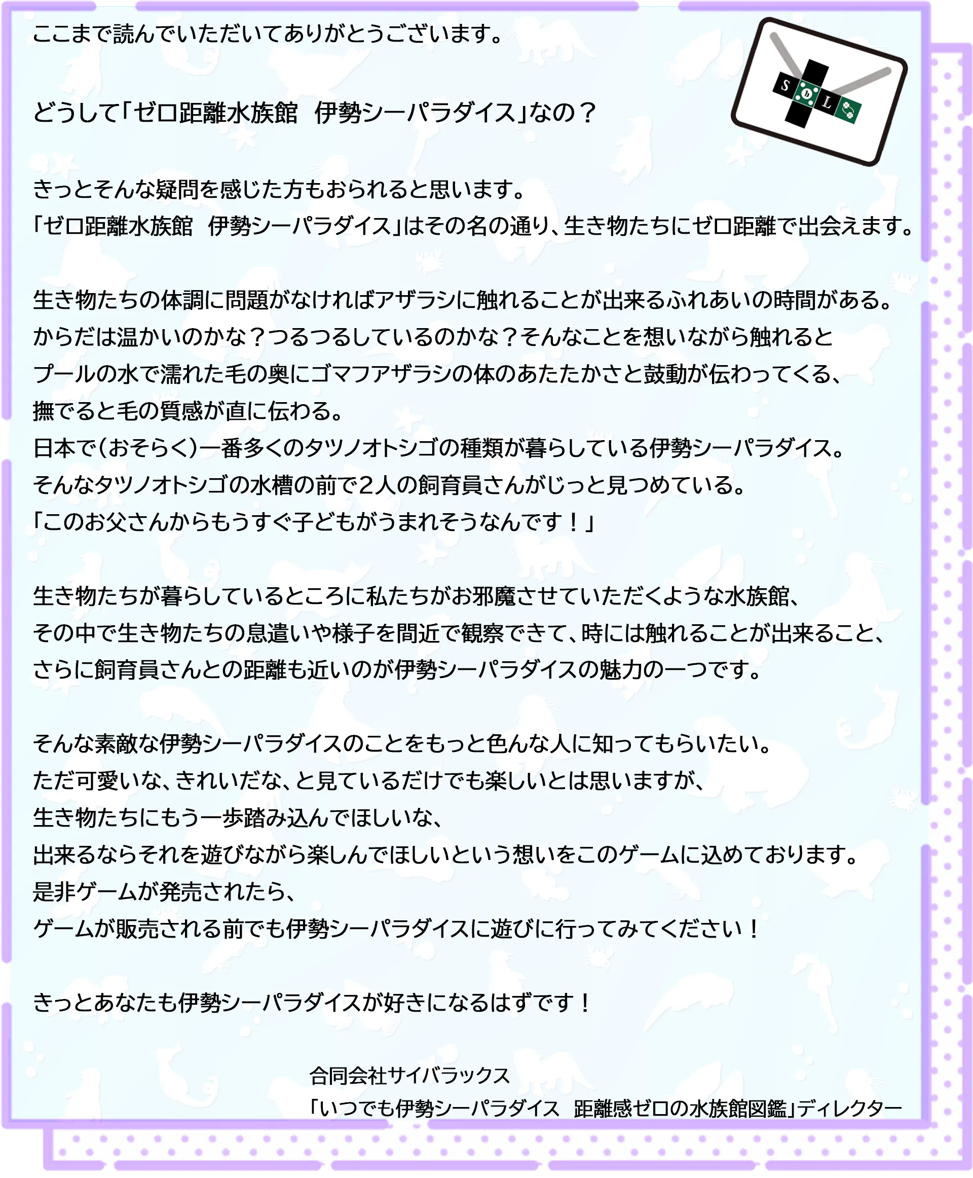 【ゼロ距離水族館 伊勢シーパラダイス様からのメッセージ】