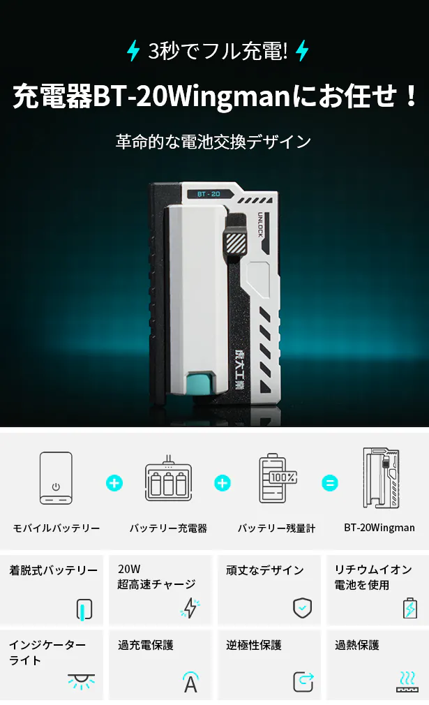 革新的な電源交換設計、3秒で電池交換でき!超コンパクトの3in1充電器BT-20Wingmanが誕生!