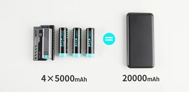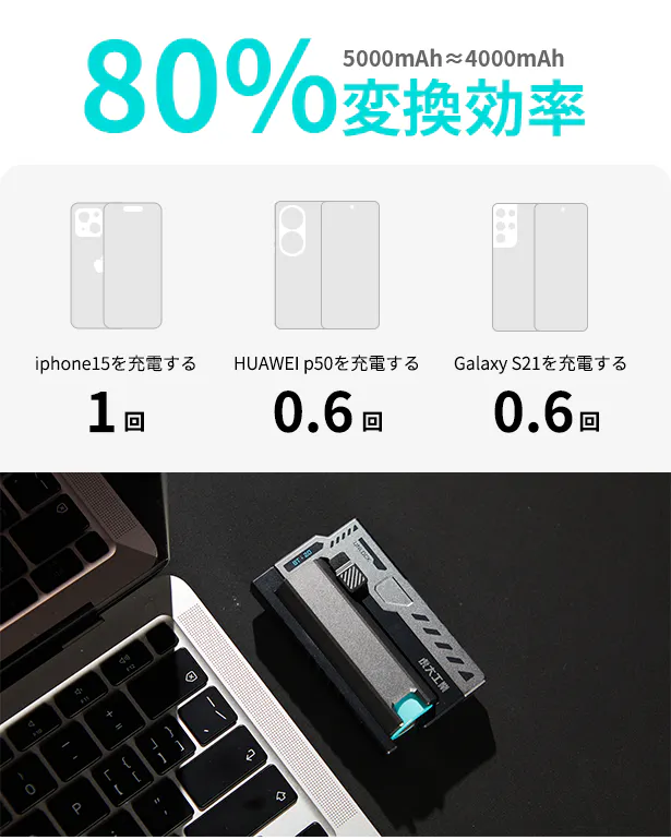 ・5000mAhの電池1本でスマホをフル充電でき、80%の変換効率で安定して持続的に充電可能。