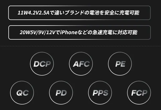 また、急速充電は、QC、PD、PPS、FCP、DCP、AFC、PEなどの主流の充電規格に対応しており、15W~20Wの高速充電が可能です。ご使用のデバイスが上記の充電規格に該当しない場合は、5V2A 10Wを使用して充電することもできます。