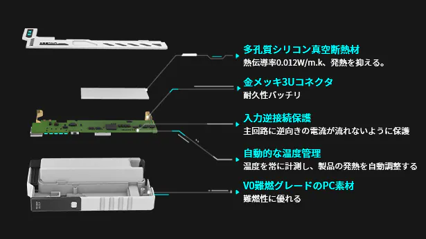 充電放電する際は大量の熱が発生します。そのため、BT-20は難燃性の素材を使用し、放熱効率が高い構造になっています。