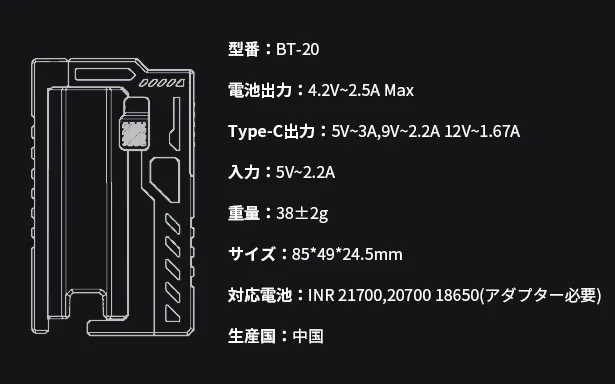 どのようなデバイスを使用していても、BT-20は充電のニーズを満たします。21700、20700、および18650電池に対応できます。2.5A電流入力による高速充電はもちろん。(5V2Aの出力の充電器が必要)