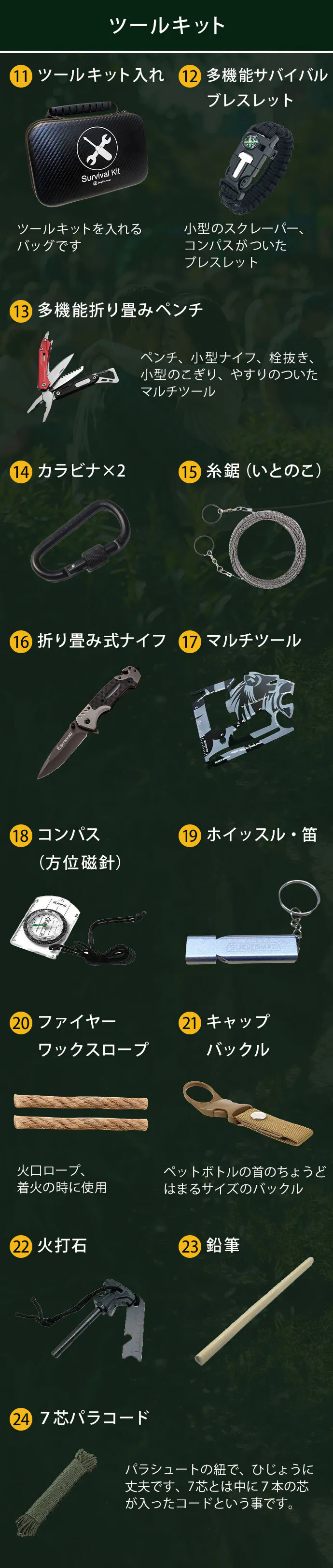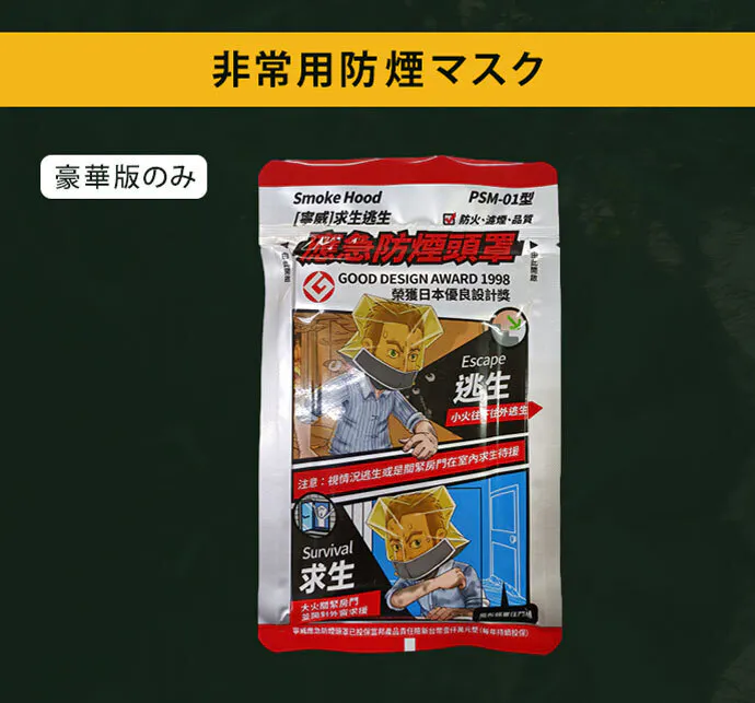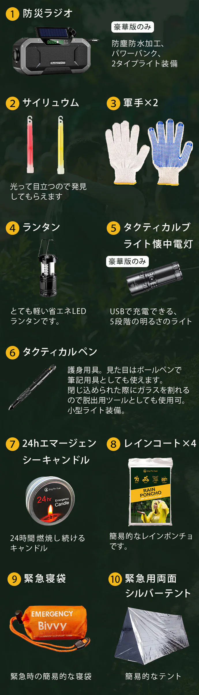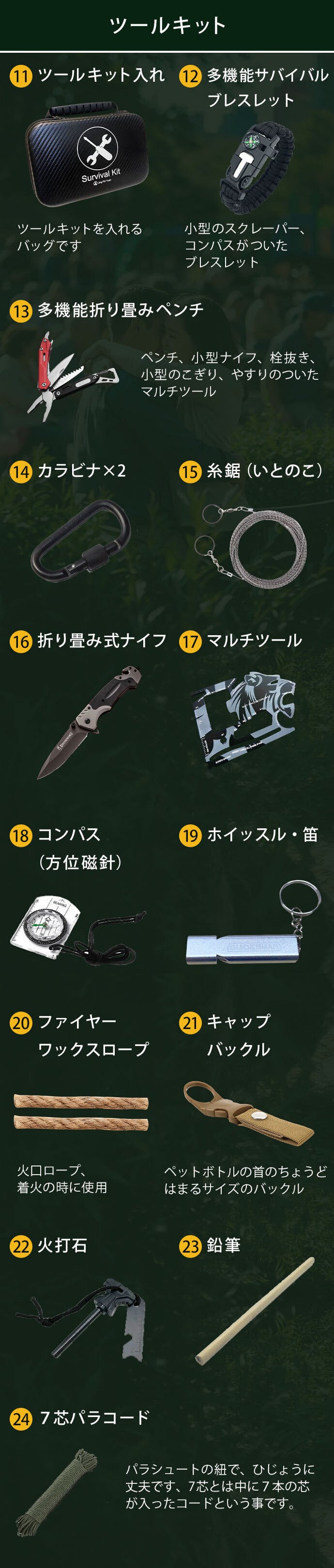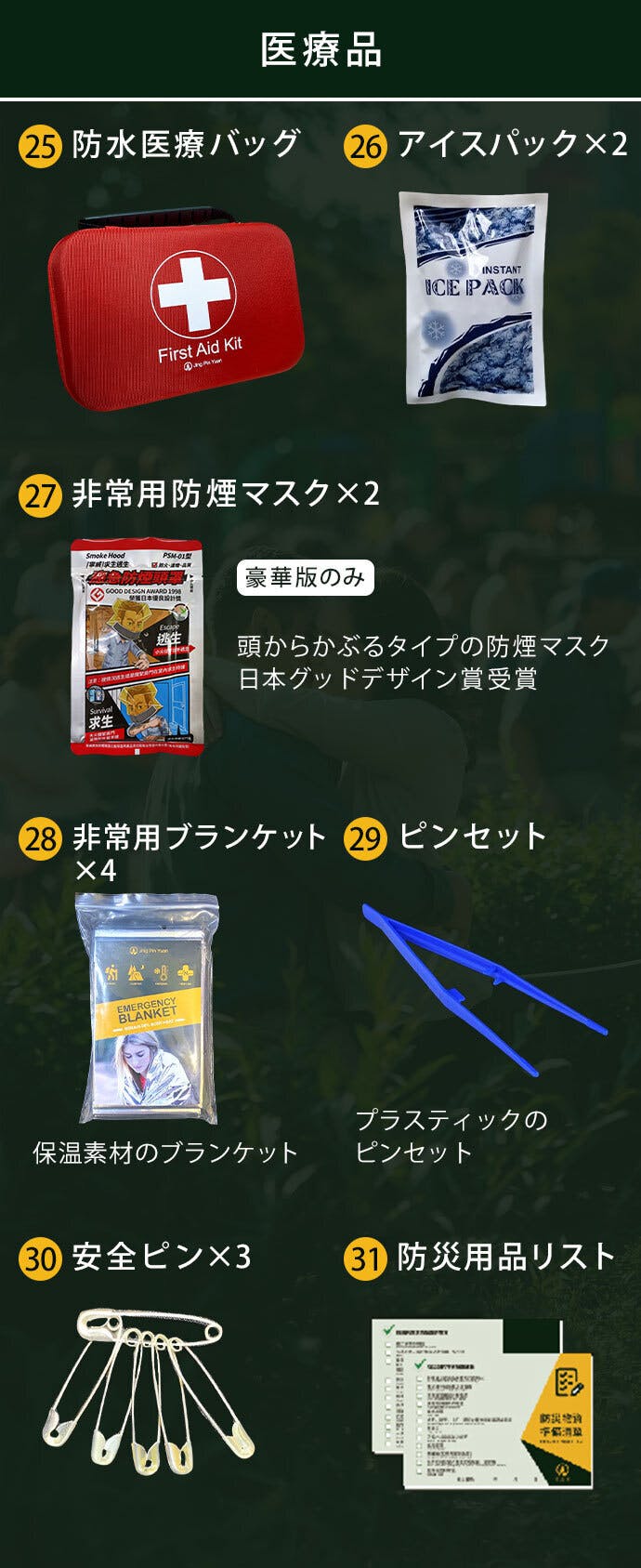 - ①【生存にフォーカスした緊急セット】快適性よりも生存を優先し、命を守るために必要な装備を厳選。