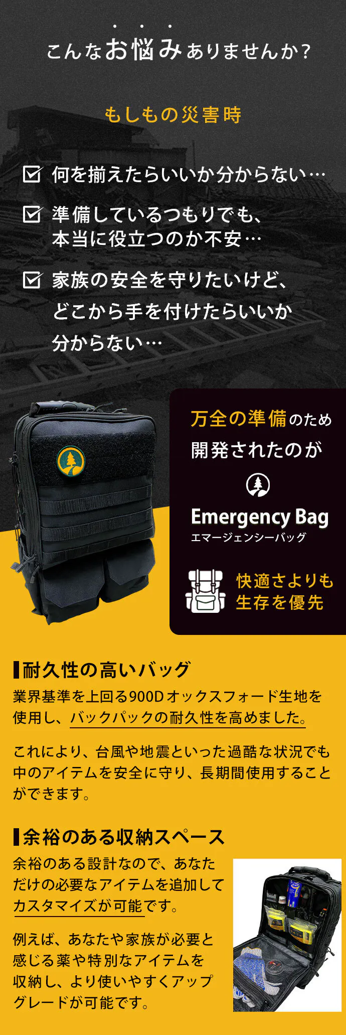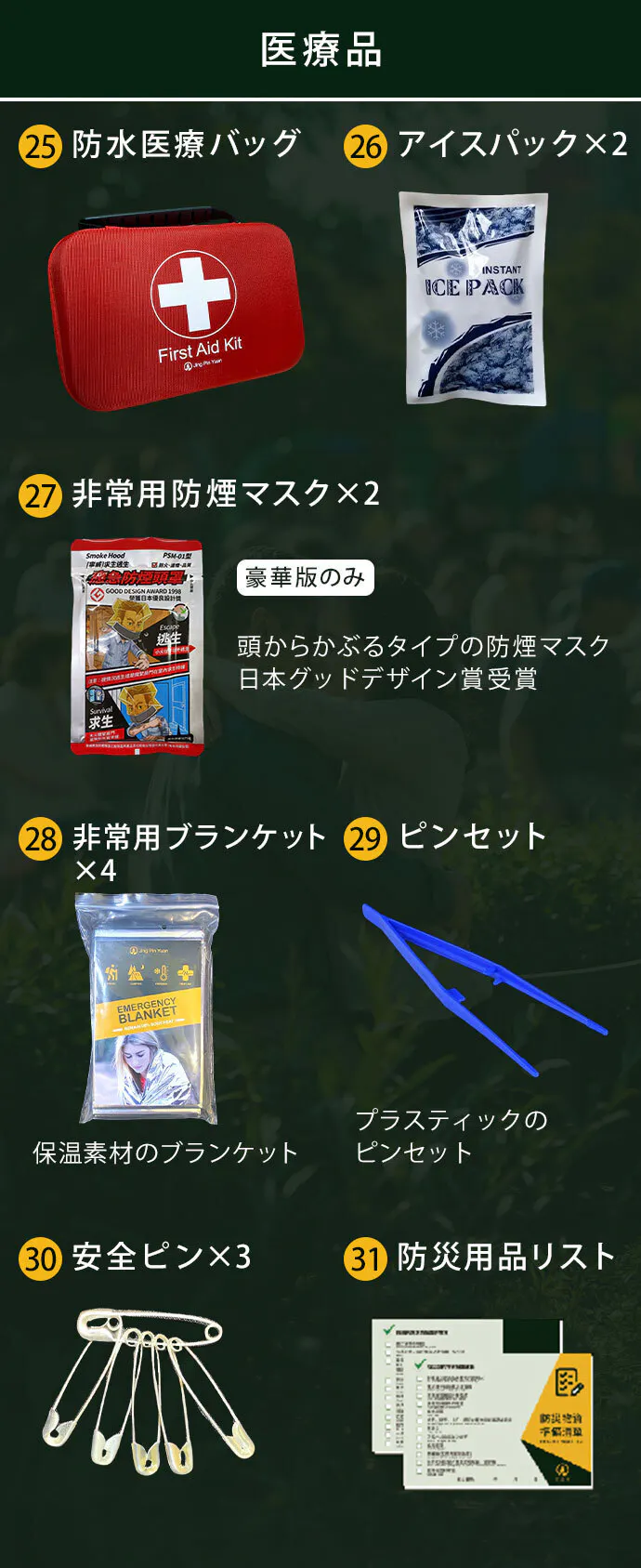 - ②【カスタマイズ可能】自分に必要なアイテムを追加し、オリジナルの緊急キットにアップグレード可能。