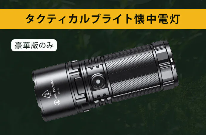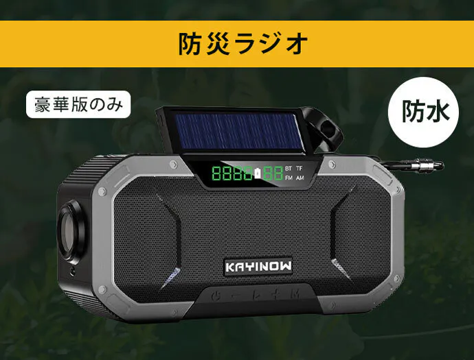 IPX6 防水レベル、携帯電話を一時的に充電できる手動発電機付き、充電器、SOSアラート、2種類のライト、コンパス、バッテリー容量5000mAh、防塵防災加工。USB-TypeCで急速充電が可能です。