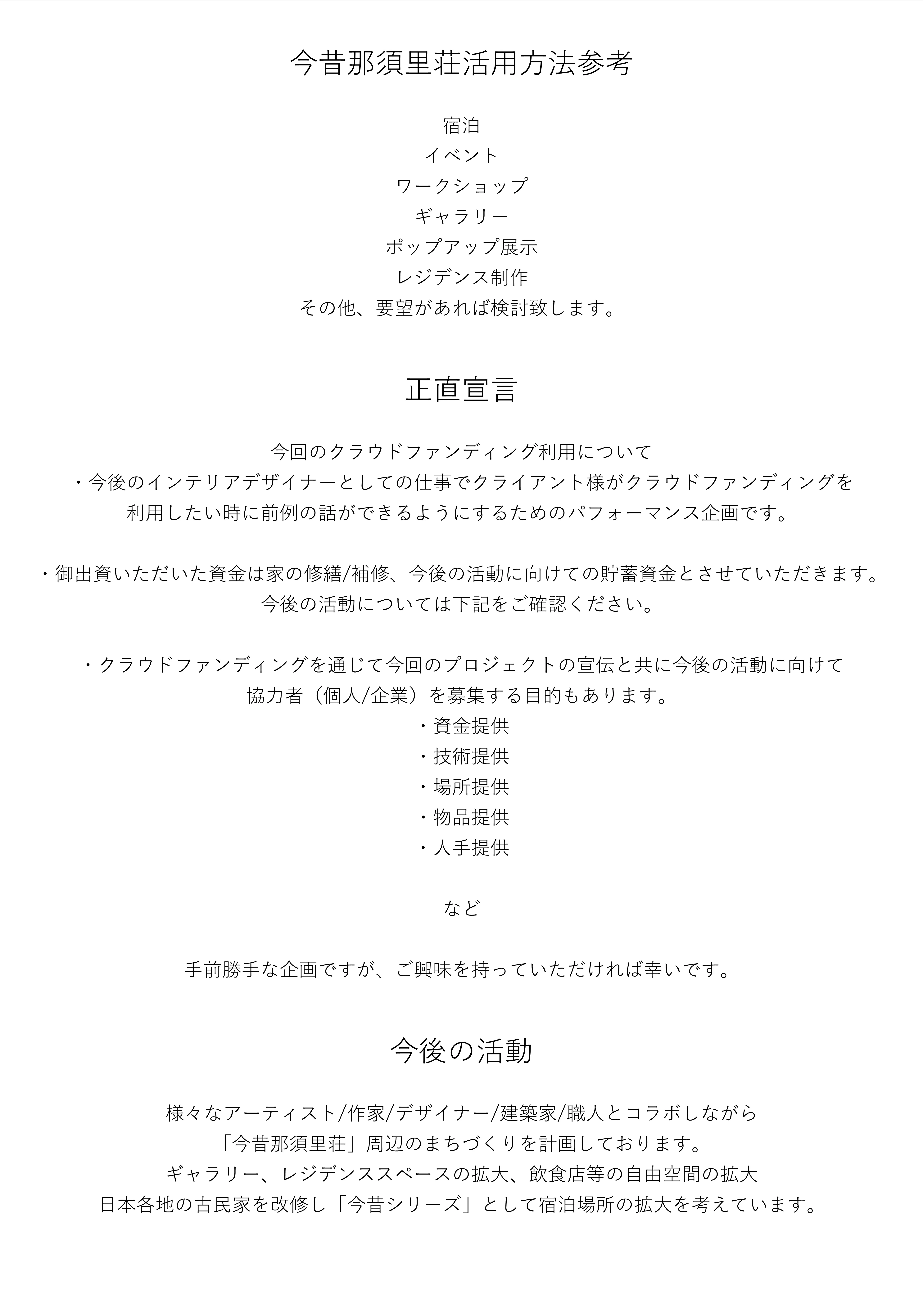 2025/04/24 16:39クラウドファンディングの残り日数が1週間を切りました。ここまでたくさんの方に興味を持っていただきとても嬉しいです。ありがとうございます。クラウドファンディングは終了いたしますが、工事はまだまだ続きますが、大枠の建築工事が完了し内装の意匠仕上げを残すばかりです。なんとか8月中にはオープンできるよう走りますので、引き続き見守っていただければ幸いです。完成した際は皆様が遊びに来ていただけることを楽しみにしています。乾杯しましょう。 もっと見る
