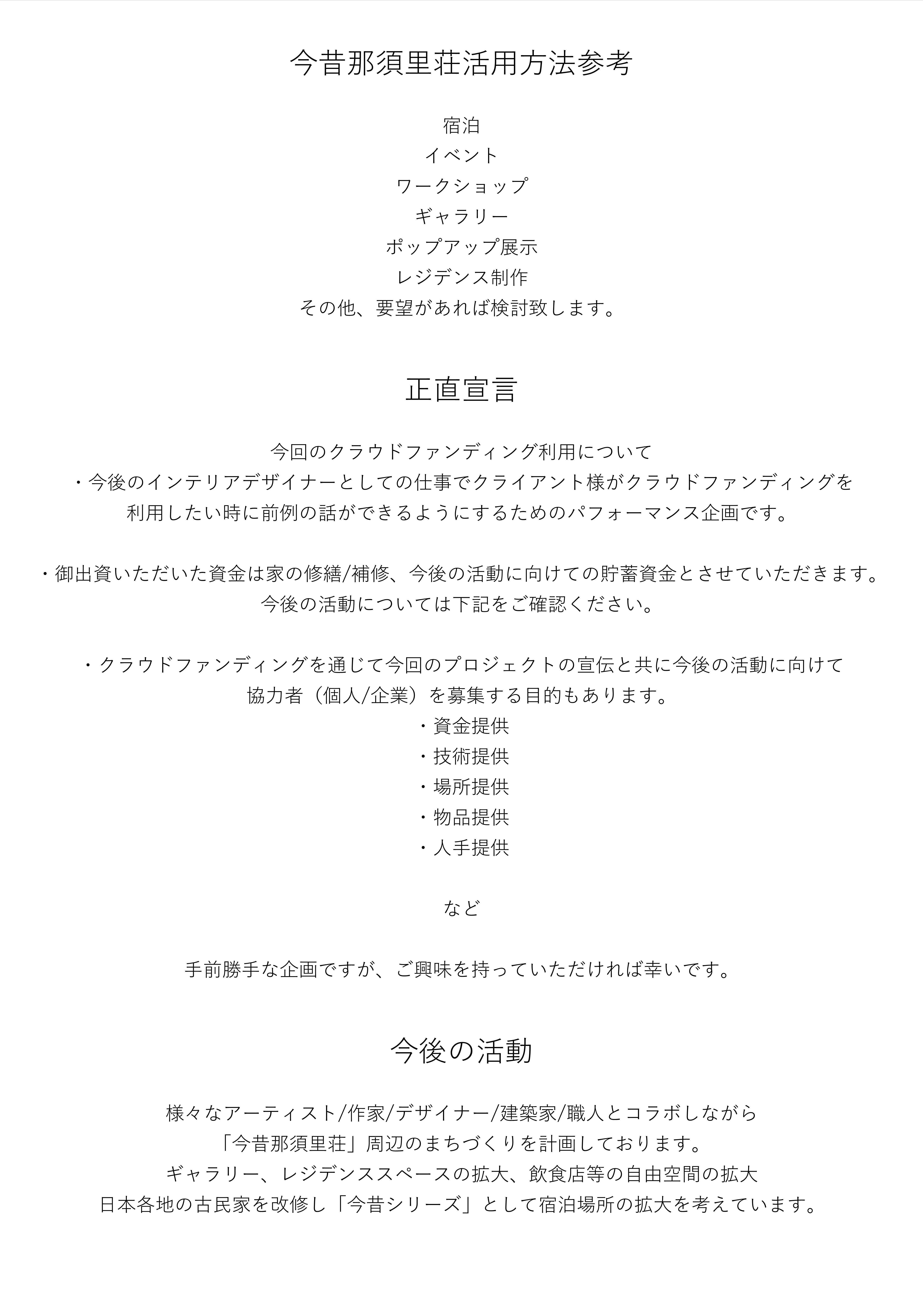 2025/03/25 10:01お世話になります。クラウドファンディングがスタートしてから早3週間がたちました。皆様のおかげで目標金額の達成ができました。本当にありがとうございます。引き続き見守っていただければ幸いです。工事の方も着々と進んでおります。インスタグラムよりご確認いただけます。オリジナルタオルが完成いたしました。「今昔那須里荘」の今昔をロゴ化し、「KNJK」の四文字をフェイスタオルとバスタオルに刺繍致しました。カラーは全6色白/黒/赤/青/緑/黄オープンした際は販売もする予定ですが、クラウドファンディングの返礼品にも含まれている為、そちらからのご支援も宜しくお願い致します。 もっと見る