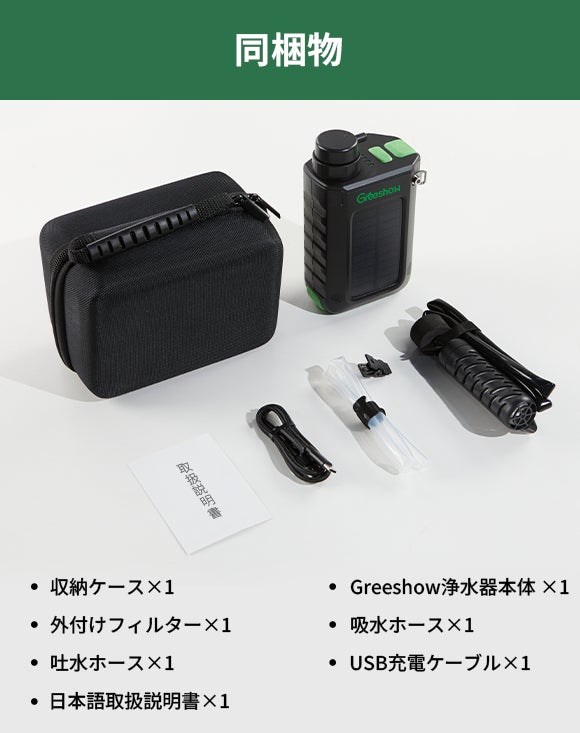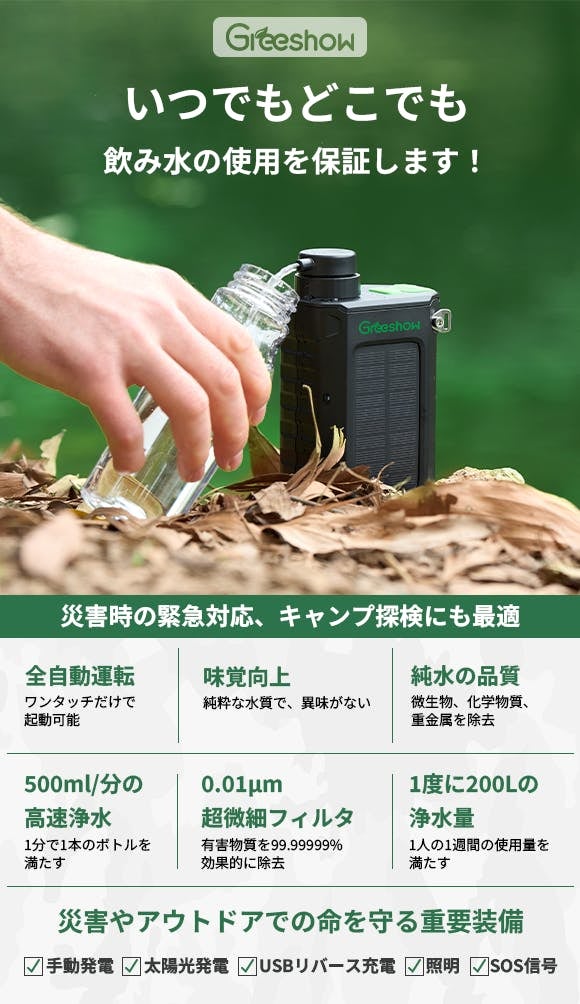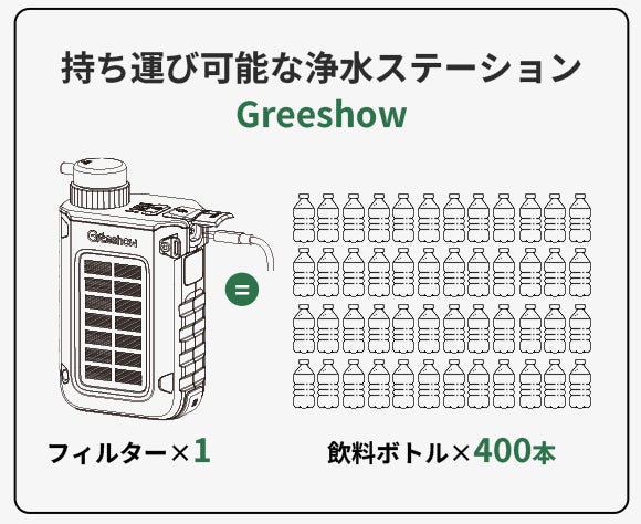 Greeshowは、あなたのそばに置いておきたい、頼れるポータブル浄水ステーションであり、災害時の備えとしても、安心です。