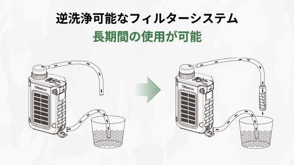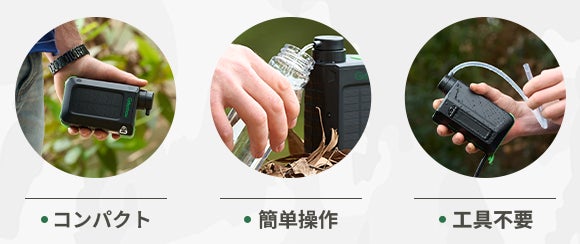 川や湖など、どんな水源でも安全な飲み水に変え、もしもの時に頼れる、ポータブルで高性能な浄水システムです。