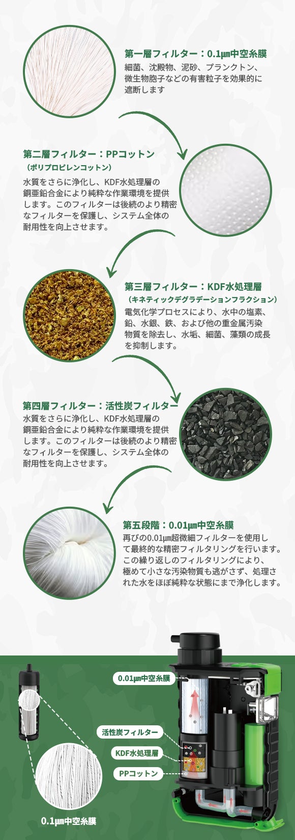 業界最先端の「5段階濾過技術」(0.1μmレベル中空糸膜、PPコットン、KDFフィルター、高品質活性炭、0.01μmレベル中空糸膜)を採用、水中の細菌やウイルスなどの不純物の99.99999%を有効的に除去し、徹底的に水を浄化します。