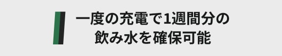内蔵の大容量リチウムイオンバッテリーは、1回の充電で約5時間稼働し、連続的に230L以上の水を浄化可能。500mlペットボトルなら400本分!1人なら1週間、家族なら2日分の水を確保できます。