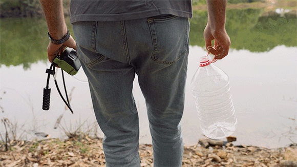 操作はとっても簡単!10秒で準備完了。 ホースとフィルターをつないで、フィルターを水源に入れるだけ。ボタンを押せば、すぐに清潔な水が流れ出します。