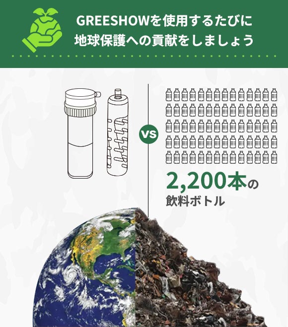 フィルター1セットで、なんと1000Lの水を浄化可能。500mlペットボトル2000本分!Greeshowを使えば、ペットボトルの消費を抑え、環境にも優しく、持続可能な暮らしに貢献できます。