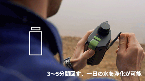 本体背面のハンドルを回すだけで、手回しで充電できます。3~5分回せば、1日分の飲み水を浄化できるほどの電力を確保できます。