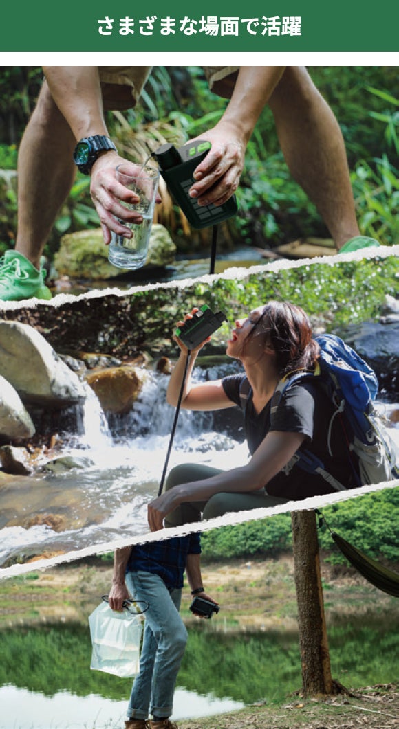 災害時の備えとしてはもちろん、水道水が不安な時や、アウトドア、緊急時の充電など、様々なシーンで活躍します。