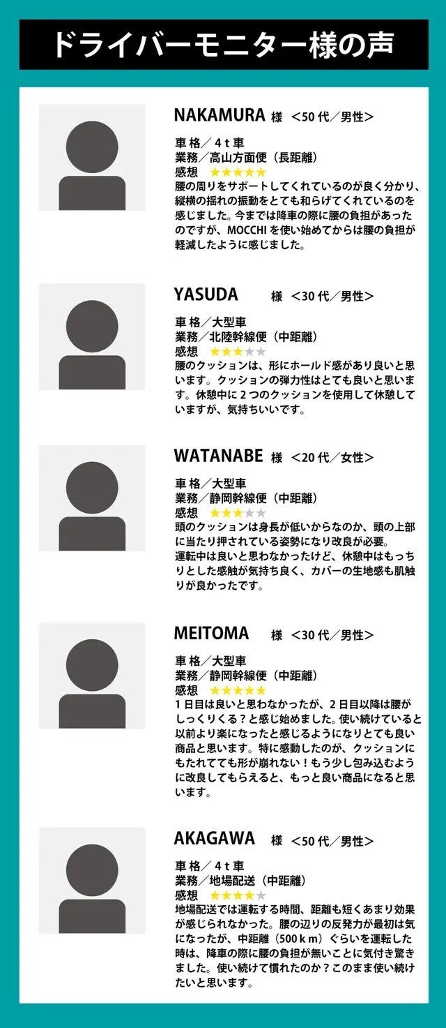 長時間の運転で感じるだるさや不快感を軽減するための改良を加え、プロの声を活かしたクッションが完成しました。ドライバーの方々の日々の負担を少しでも和らげることができるよう、実践的なアプローチで開発されたこの商品をぜひお試しください。