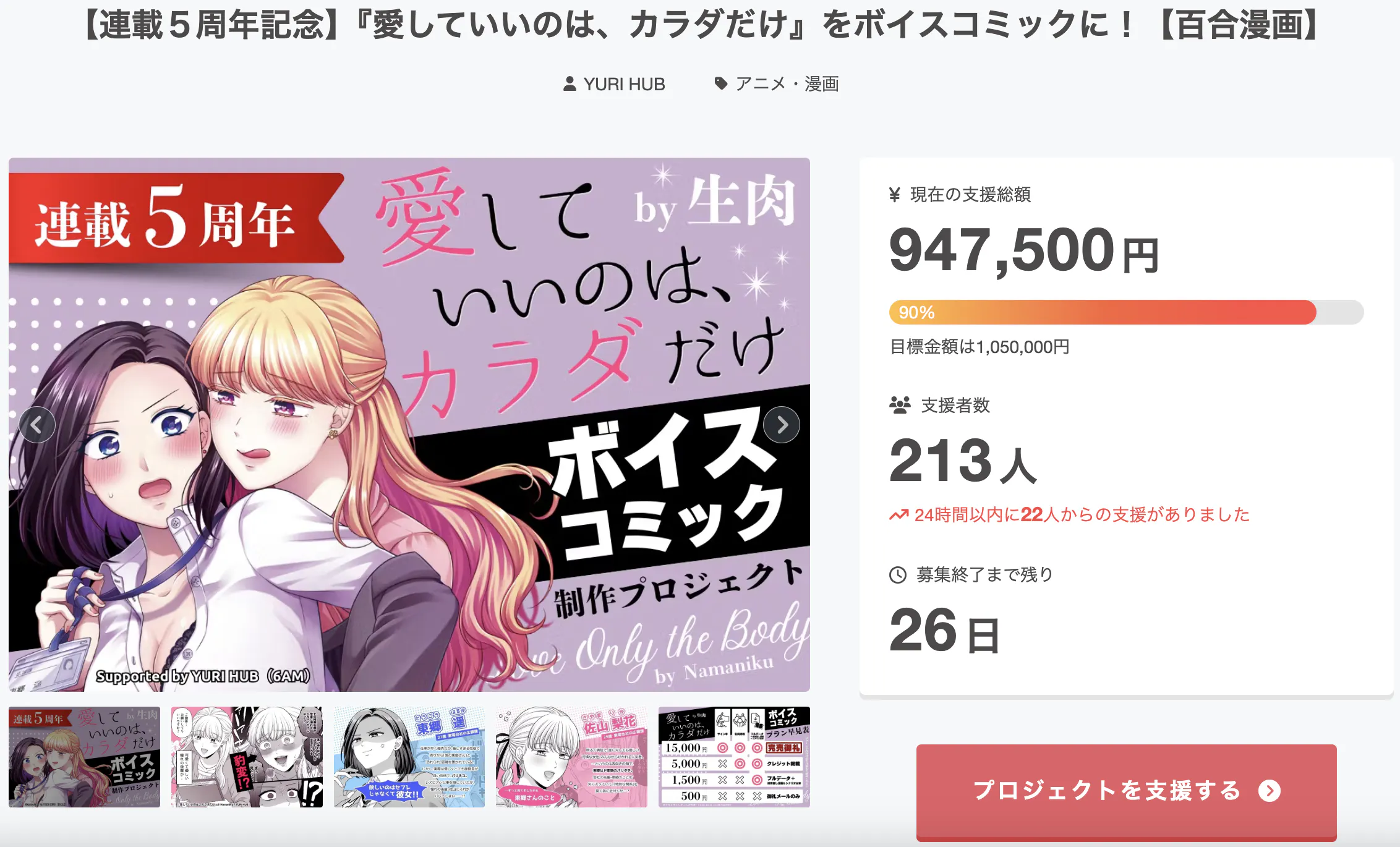 ゴールまであと少し…!このプロジェクトを100%達成し、さらに多くの方に『愛していいのは、カラダだけ』のボイスコミックを届けるため、引き続きご支援・拡散のご協力をお願いできますと幸いです。
