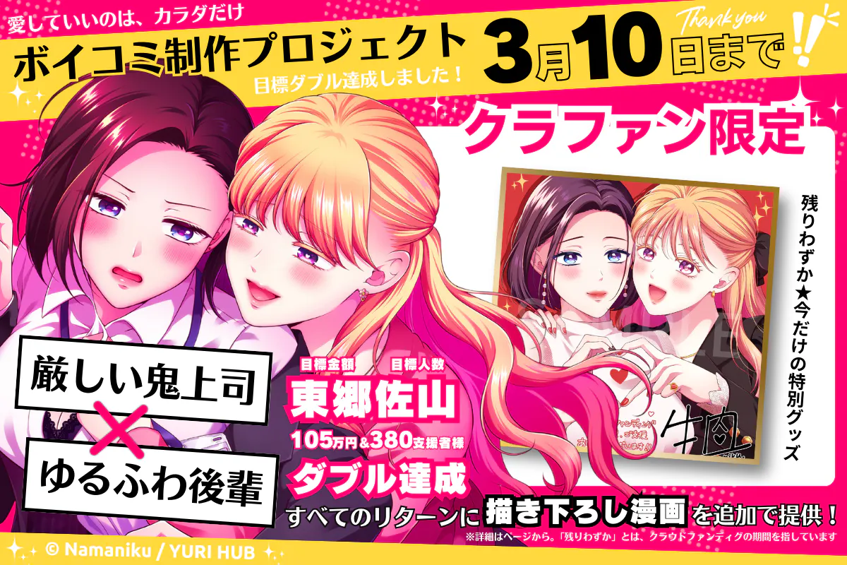 こんばんは、YURI HUBです!『愛していいのは、カラダだけ』ボイスコミック制作プロジェクトへのご支援者様数が400名様を突破しました! 本当にありがとうございます!