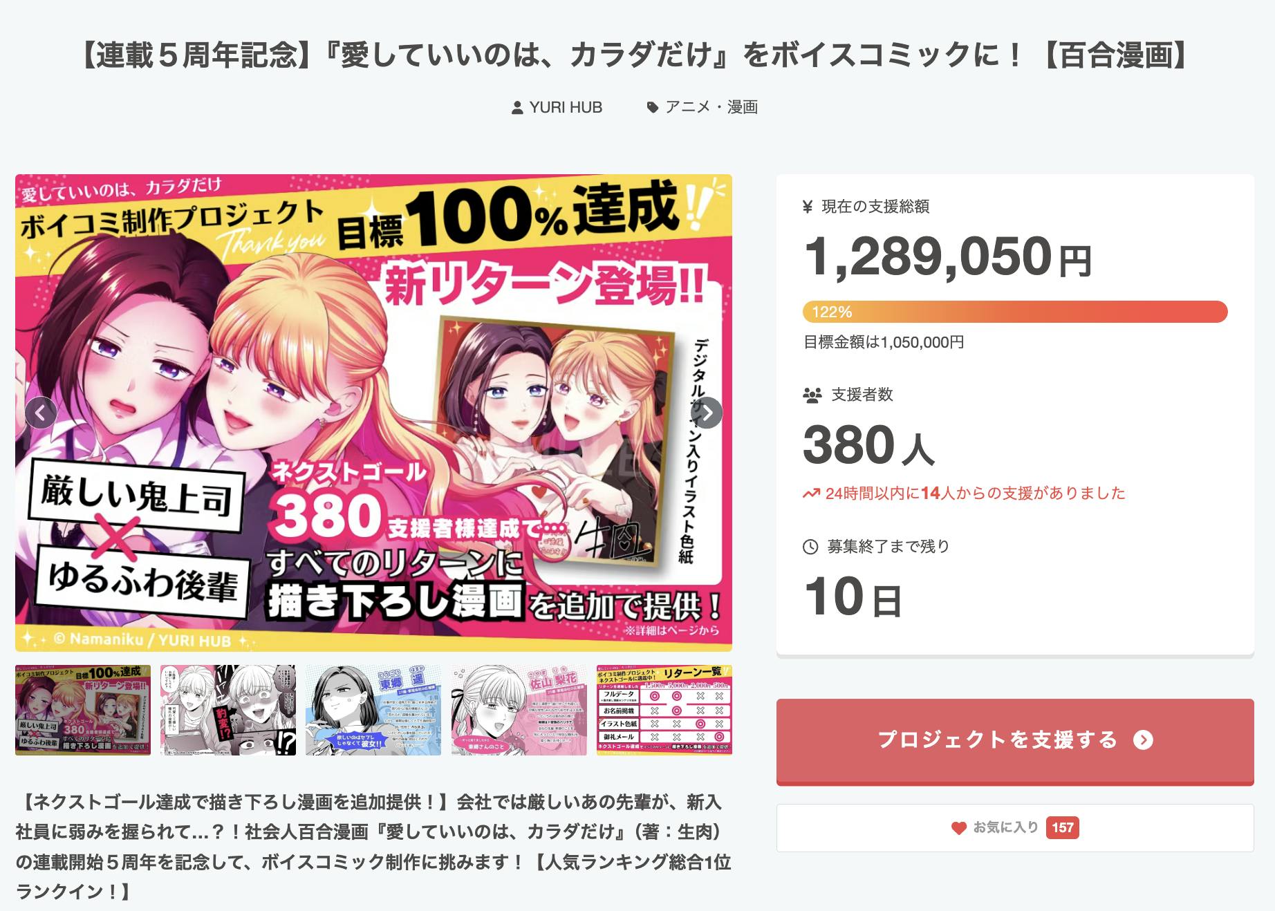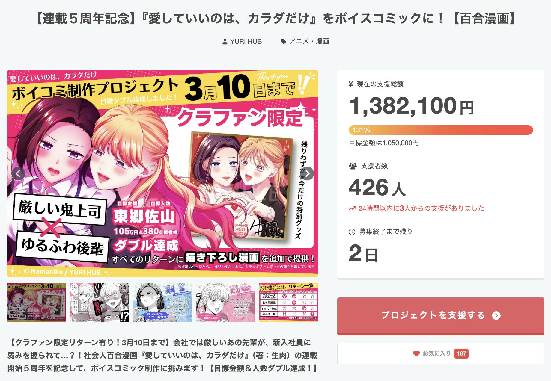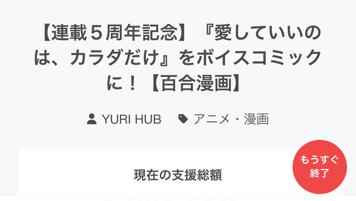 Only 2 days left until the crowdfunding campaign ends!Find out more from YURI HUB!https://www.yurihub.com/lob-voice-comic♡ ♡ ♡こんばんは、YURI HUBです!『愛していいのは、カラダだけ』ボイスコミックプロジェクト、クラウドファンディング終了まであと2日となりました…!皆さまの温かいご支援のおかげで、開始5日で100%の105(東郷)万円を達成し、CAMPFIREの「アニメ・漫画」カテゴリで1位、さらに人気プロジェクト総合ランキングでも1位を獲得することができました!さらに、ネクストゴールの380(佐山)人も達成しただけでなく、現在ではご支援者様数が400名様を突破しています。ここまで来られたのは、皆さまの応援のおかげです。本当にありがとうございます!クラウドファンディングの締切は3月10日(月)23:59まで。クラファン限定のリターンもあり、今しか手に入らない内容もあるので、最後まで応援していただけますと嬉しいです!残り2日、どうぞよろしくお願いいたします!YURI HUB(6AM合同会社)プロジェクトチーム一同
