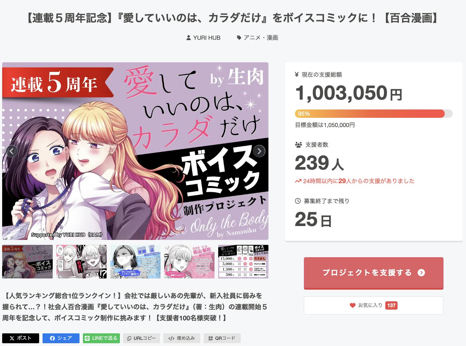 皆さまこんばんは!YURI HUBです。いつも『愛していいのは、カラダだけ』ボイスコミック制作プロジェクトを応援くださり、誠にありがとうございます。「肉の日」(2月9日)に開始し、「東郷」万円(105万円)を目標にはじめたクラウドファンディングは、バレンタインデーに目標を達成させていただいた後も、おかげさまで毎日ご支援いただいておりました。そして、猫の日である本日より、新たなゴールに向けて動き出しています!「東郷さんの105万円を達成したからには、次に目指すのはもちろん佐山さん」ということで、「佐山」人(380名様)のご支援者を達成できた場合、すべてのリターンでご支援くださった皆さまに描き下ろし漫画(4P予定)を追加でご提供いたします!!!また、このネクストゴールを達成するために、新リターンを追加いたしました!↓新リターンの購入はこちらから↓https://camp-fire.jp/projects/816630/view#menuさっそくご支援くださった方々のおかげで、なんともうご支援者様数が300人を超えています…!本当にありがとうございます!皆さまのお力を借りながら、このプロジェクトをより多くの方々に広め、「東郷佐山」を達成(?)できますと幸いです。今日から三連休でご予定のある方も多いかとは存じますが、お時間のあるときに引き続き応援をお願いできますと有り難く、何卒よろしくお願いいたします。YURI HUB(6AM合同会社)プロジェクトチーム一同