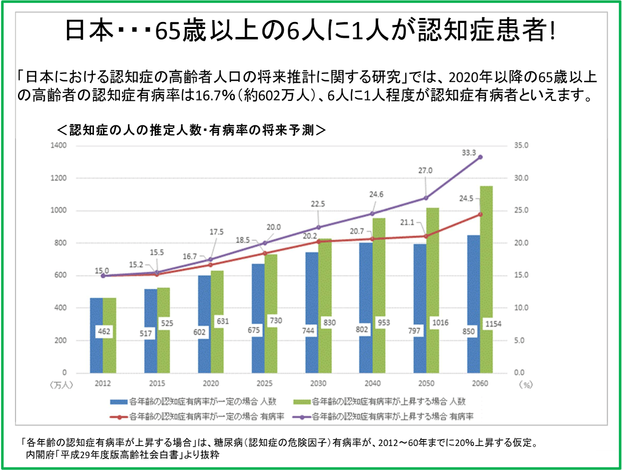 日本は65歳以上の6人に1人が認知症患者です。親、兄弟、親戚など、もしかしたら皆さんの周辺にも認知症の方がいらっしゃるのではないでしょうか。