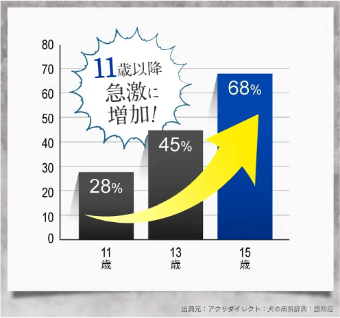 昔はなかなか10年以上生きられる犬は少なかったのですが、日々の健康を気遣う飼い主さんが増えたおかげで平均寿命は14歳以上に伸びています。そしてイヌの認知症は下記のように11歳以降で急激に増加しています。