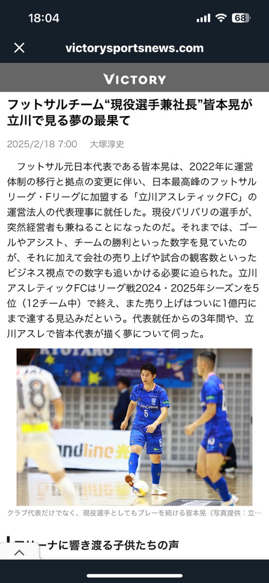 スポーツメディア「VICTORY」にてクラブ代表理事の皆本晃インタビュー記事を掲載していただきました!!選手兼代表理事としての苦悩や立川に移転して何をやってきたのか、今後の挑戦などインタビューしていただきました。取材は立川の試合会場にも何度も来てくださっている『大塚淳史』さん!長年、皆本を見て来てくれたからこそ、色々引き出してくださっています。まだ見てない方も、もう見たよという方もぜひ何度でも見てください!〈「VICTORY」記事ページ〉https://victorysportsnews.com/articles/8971また、同記事はyahoo!ニュースにも掲載していただきました!内容は一緒ですが、あわせてご一読ください!!!〈「yahoo!ニュース記事ページ」〉https://news.yahoo.co.jp/articles/5a5d8c2b713544364276a73c743f3074bfa4d022