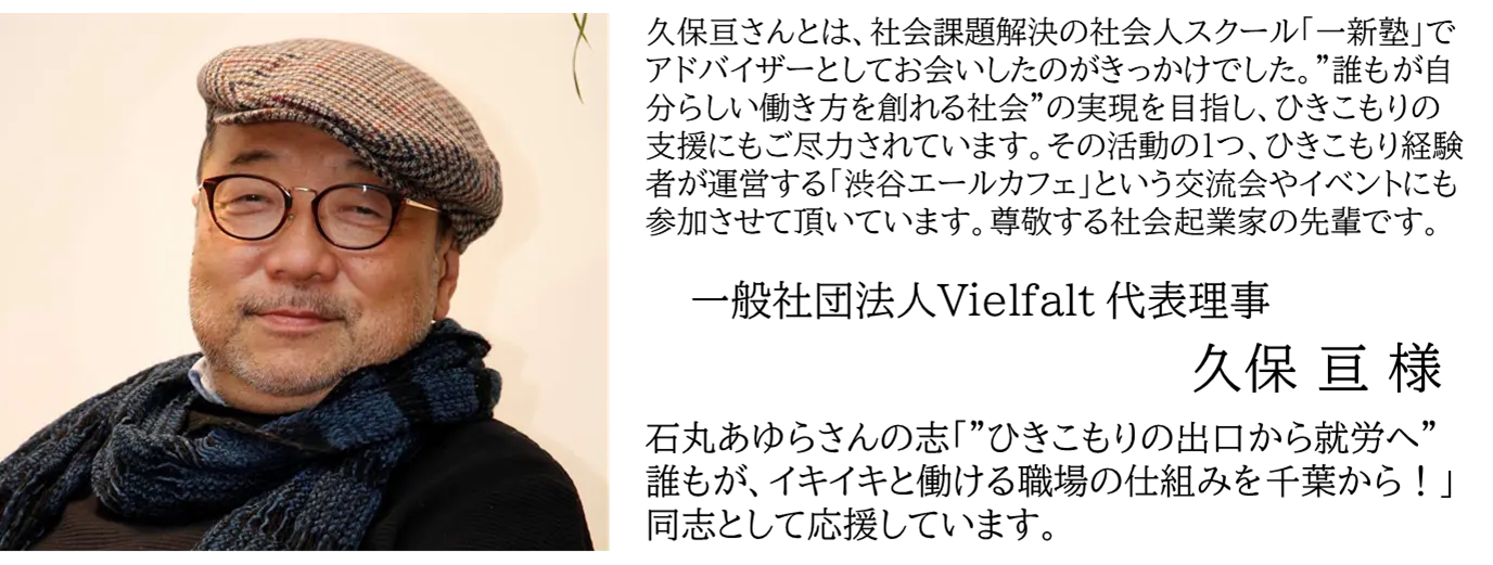 日本は少子高齢化が進み、労働力の減少が社会課題になっている昨今、ひきこもりの潜在的労働力を職場の仕組みと地域の支え合いによって活かしていく社会が作りたいのです。働くことは楽しい事ばかりではないですが、働いていることは自分らしくいるために必要な要素だと思っています。1度や2度休んだとしても私は3度休みましたが(笑)何度でもいつからでもやり直せる、それを支え合える仕組みが出来たらと思っています。