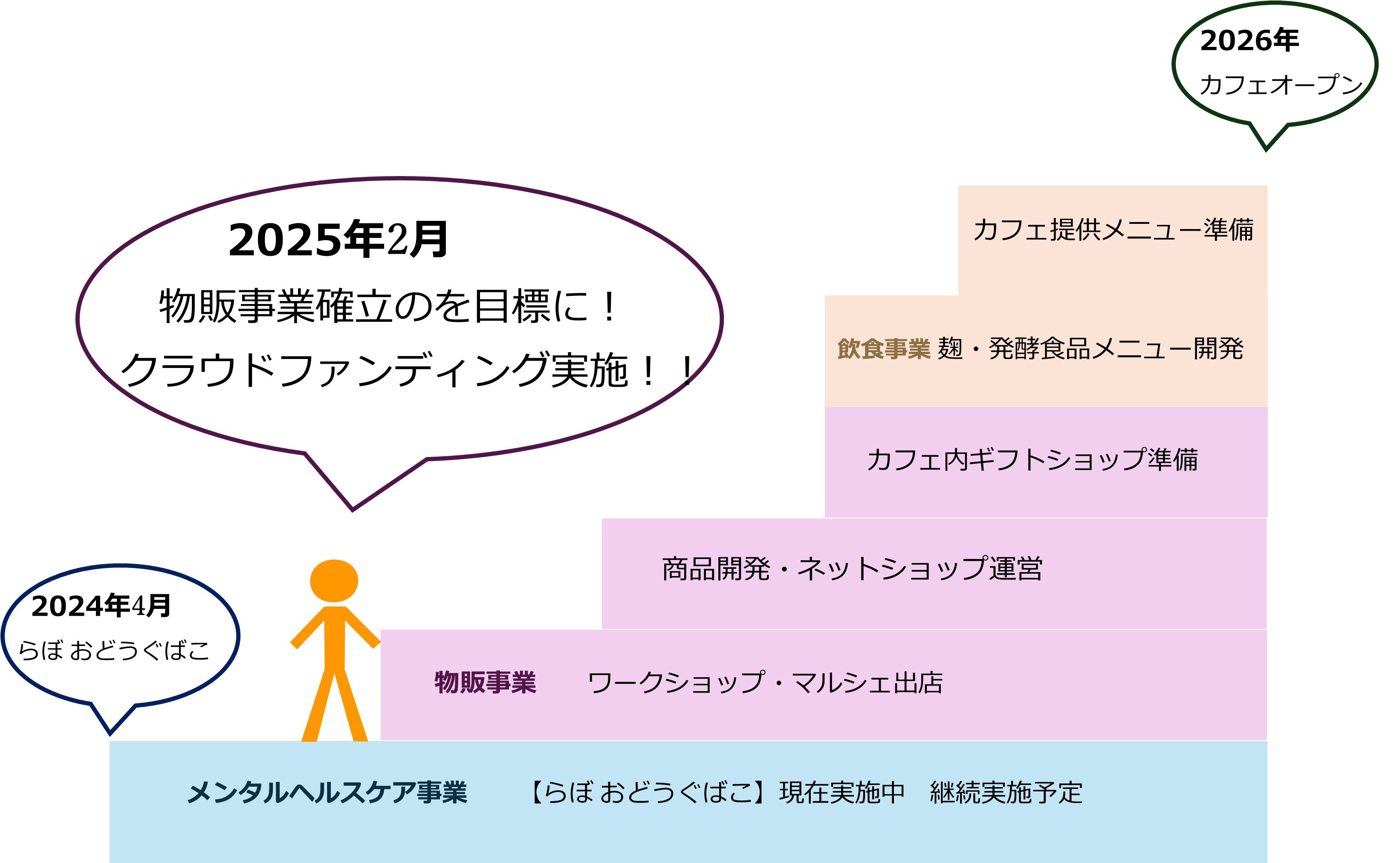 構想2年。2024年4月からメンタルケア事業を始め、2025年これから物販事業の階段に挑むところです。