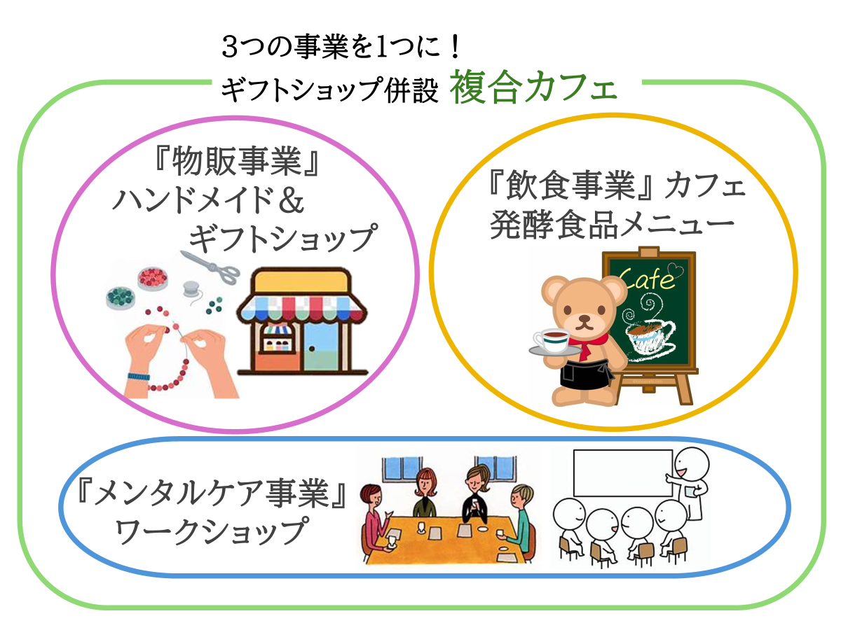 これが、「メンタルケア事業」「物販事業」「飲食事業」を1つの職場内で行いたい理由であり、『ギフトショップ(ギフト工房)を併設させた複合カフェ』をオープンさせる目的です。