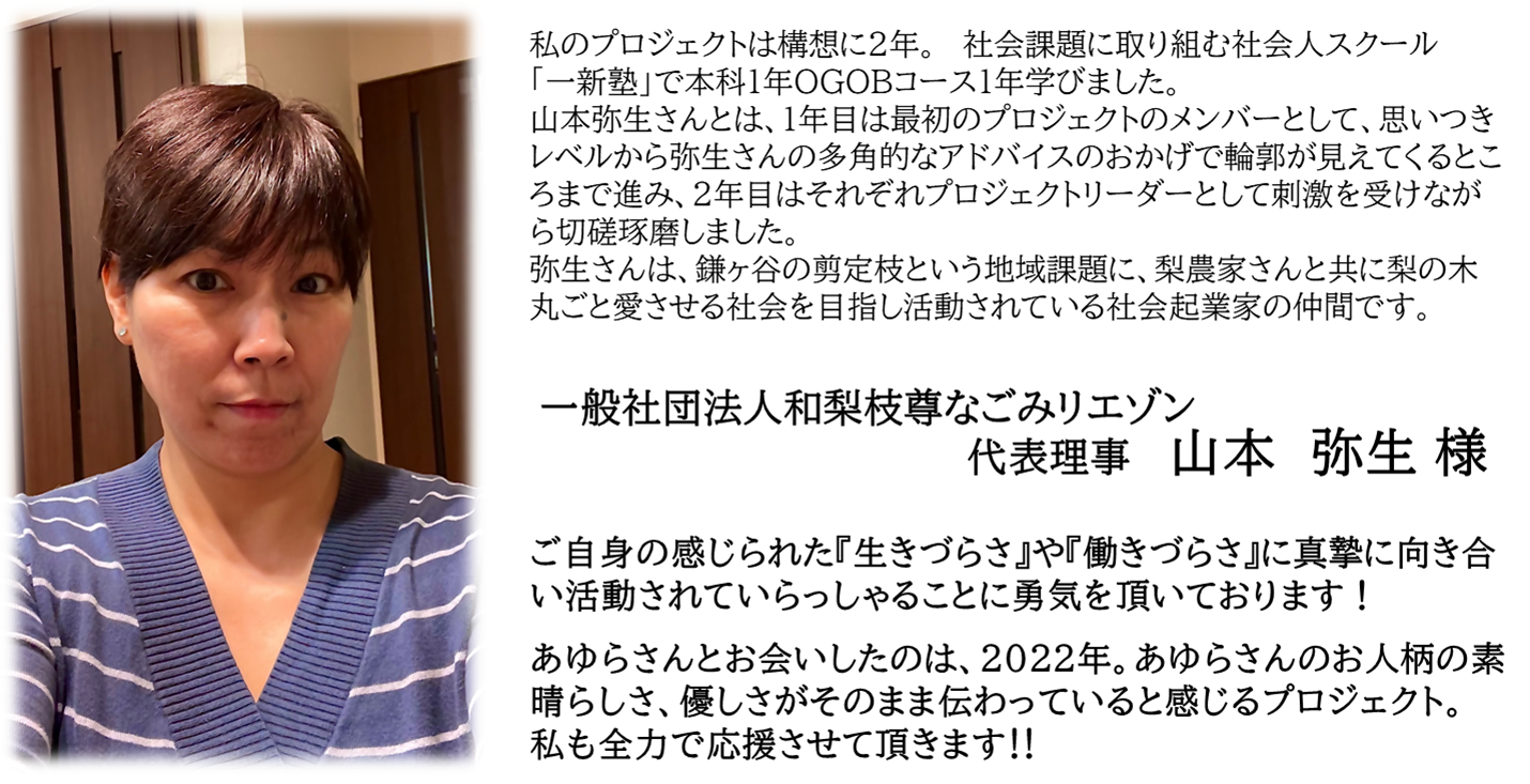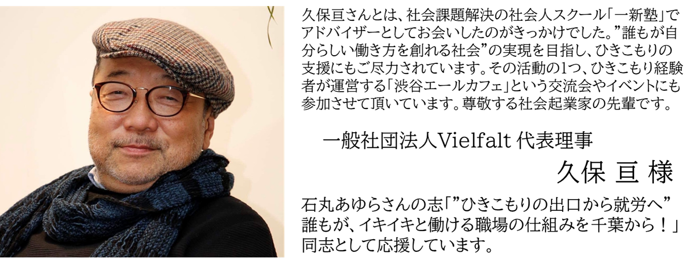 日本は少子高齢化が進み、労働力の減少が社会課題になっている昨今、ひきこもりの潜在的労働力を職場の仕組みと地域の支え合いによって活かしていく社会が作りたいのです。働くことは楽しい事ばかりではないですが、働いていることは自分らしくいるために必要な要素だと思っています。1度や2度休んだとしても私は3度休みましたが(笑)何度でもいつからでもやり直せる、それを支え合える仕組みが出来たらと思っています。